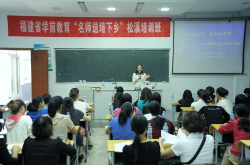 为响应国家和我省关于加快学前教育发展的号召,推动农村学前教育的改革与发展,帮助农村边远地区幼儿园教师进一步提高专业水平和教育教学能力,省教育厅委托我院与省幼儿教师培训中心在全省范围内组织学前教育"名师送培下乡"活动,松溪县的培训班惠及该县所有公办园和注册的民办园。福建省幼儿教师培训中心组织了一支由教科研专家、福建省幼教学科教学带头人组成的培训者队伍,经调研与沟通,针对农村幼儿园"小学化"问题和先进理念操作化需求而设计课程,通过专题讲座、教育教学观摩、专题研讨等方式宣讲科学保育与教育的理念与方法,并开展了现场教学示范、研讨与答疑活动。本次培训引起了松溪幼教界的强烈反响,受到了教育局领导和全县参训园长、教师的热烈欢迎和高度评价。培训期间,还组织了省级示范性教育活动现场观摩、研讨与互动,解答了老师们困惑已久的种种问题。