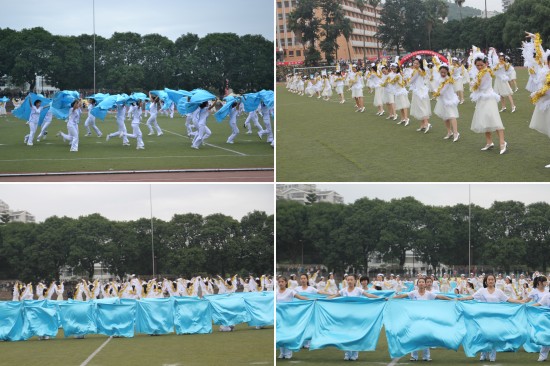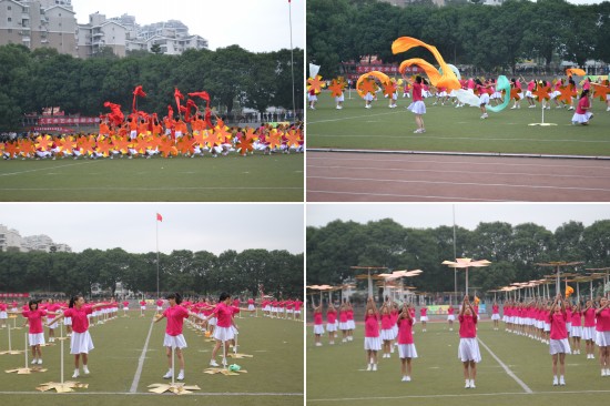 在演出中,艺术系的《鼓动长安》以巨大的阵势率先亮相,数十名鼓手挥舞裹着红绸的鼓槌,上下翻飞,一同敲击十余面大鼓,发出阵阵节奏欢快、铿锵有力的响亮鼓声,其间加入的肖豆豆老师的女高音独唱,气韵行云流水,声音高亢入云。鼓声与歌声互相应和,相得益彰,一同显示出一种威武雄壮与自信豪迈的民族气概。人文系带来的舞蹈《放飞梦想》,则在美妙乐声中陡然绽放出一朵朵明丽的葵花,画面色彩十分艳丽。伴着动感的乐曲,演员们迈开欢乐的舞步,舒展婀娜的身姿,寄予了梦想高飞、青春灿烂的意愿与情怀。学院啦啦操队星光璀璨,带着在福建省第十四届大学生运动会上喜获佳绩的声誉,献演了《活力啦啦操》。这个节目韵律鲜明,动感强劲,魅力四射,抒发了一代学子澎湃激情,迸发出蓬勃青春活力。学前系2011级新同学刚完成了强健体魄、磨练意志的入学军训,他们此次表演的是军体拳。同学们的拳术虎虎生威、气势逼人,再现了曾经的火热军旅生活,展示了健康成长的青春风采。艺术系管乐队是我院艺苑百花丛中的一枝奇葩,他们的行进管乐队表演《走向复兴》,以多变的队形、丰富的组合和响亮的乐声震撼全场,显示出我院师生与全国各族人民一起团结奋斗,努力实现中华民族伟大复兴的愿望和决心。外语系出场的演员们在其舞蹈节目《飞得更高》里,以一波推着一波、一浪接着一浪的湛蓝海浪,以及勇敢逐浪、尽情翱翔的海鸥意象,表现出学子们为自己、为学院事业腾飞而鼓荡的激情。在学前系的《欢乐和谐》里,飘扬的扇绸在风车造型中来回穿梭,以动感的节拍和跳跃的旋律,呈现出飞扬的激情,表现出同学们携手今天、展望明天,带着美好的梦想奔向灿烂辉煌的巨大欢乐。