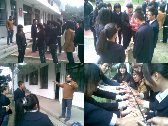 此次团体辅导共包括理论提升与室外拓展两个部分。从进入教室到理论讲座开始前,谢老师就细心地观察着每一位干部,并用形象生动的生活趣事与干部们分享:不管做人做事做学问,最重要的是态度,态度决定一切。谢老师从古老的寓言故事开始引入理论提升部分,通过团队定义与特征、概念理解注意事项、团队认识与图形欣赏及名言警句等,让大家理解意识到团队的巨大力量和正确的团队认知;室外拓展部分,主要以游戏的形式进行,谢老师将干部们分成3小组,首先进行热身游戏"后方支援",考验的是干部们的反应能力。接着通过"举竿齐眉"的游戏,培养了学生干部的观察能力及团结协作能力。最后一个游戏是"急速60秒"游戏。通过游戏,同学们意识到要顺利完成任务,需具有团队意识,团队合作的能力。