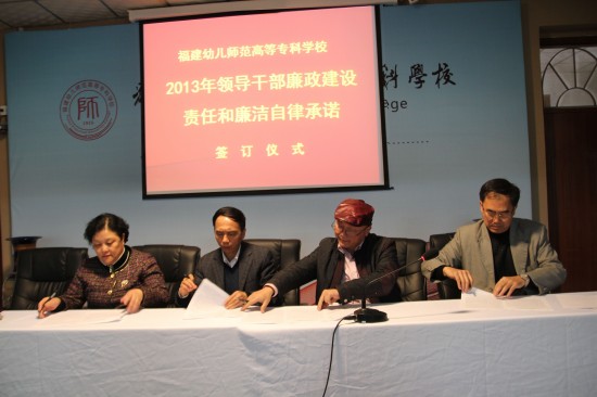 会上,校领导、科级以上干部向学校党政主要负责人层层签订了2013年党风廉政建设责任书和廉洁自律承诺书。