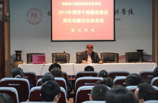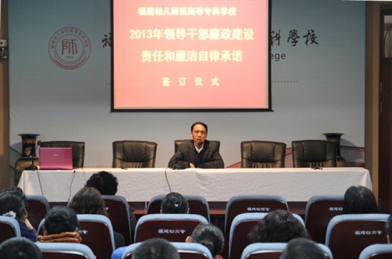 校纪委王福阳书记就《福建幼儿师范高等专科学校领导干部实行廉政责任和廉洁自律承诺的规定》做了详细解读。要求各级党员干部要认真落实党风廉政建设责任制,严格履行"一岗双责",把反腐倡廉建设、风险防控管理机制与各项工作结合起来,做好部署和落实。