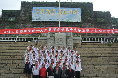少先队主题大队会观摩活动是人文科学系的特色专业活动之一,今年是第二次举办。本次队会观摩与"道德讲堂"实践活动相结合,体现了知行的高度统一。活动在大队长林炜同学铿锵有力的整队报告人数中拉开了序幕。本次活动由出队旗、敬队礼、唱队歌、节目表演、呼号、退旗、总结寄语、领导点评等环节组成。围绕"红领巾相约中国梦"这一主题,同学们精心准备了精彩的节目。既有小合唱《小小少年》,也有富有童真童趣的儿童舞蹈《校园的早晨》;既有烘托少年对祖国热爱的诗歌朗诵《祖国,我爱你》,也有体现祖国强大兴盛与一代代少年努力成长密切相关的《我的梦,中国梦》;此外,小品《都是西瓜皮惹的祸》、主体绘画展示等也堪称精品。观摩活动在庄重的退旗仪式后圆满完成。人文科学系党总支严桂泉书记做总结讲话,并向同学们提出了不断提高初等教育各种素质的希望;最后,系主任陈强对活动进行精彩点评。