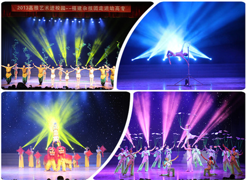 校团委胡华荣副书记代表学校致欢迎辞后,精彩喜庆的舞蹈《龙腾虎跃》拉开了演出的序幕,活泼可爱的《海趣——少儿软功》,幽默丰趣的《滑稽表演——拍电影》、魔术《变、变、变》,惊险高难度而又唯美浪漫的单杆技巧《觅》、肩上花盘《花韵》,令人瞪目结舌的地圈《穿越》、对手顶技《精·气·神》、抖杠《竹林欢歌》等等精彩节目,一环扣一环,令人目不暇接。曾荣获多项国际大奖的绳技《灵魂向远方》,更是让现场观众深深沉醉在高难技巧和优美舞蹈构成的杂技世界中。演出在观众热烈的掌声和欢呼声中落下了帷幕。