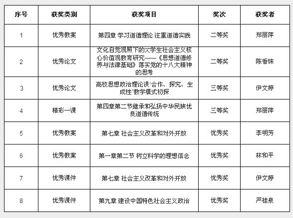 2013年12月26日,中共福建省委教育工作委员会、福建省教育厅公布了党的十八大精神进高校思想政治理论课"四个一百"评选活动的结果,我校6位老师的8个参赛作品均获得优异的成绩,其中二等奖2个、三等奖2个以及优秀奖4个。具体获奖情况如下: