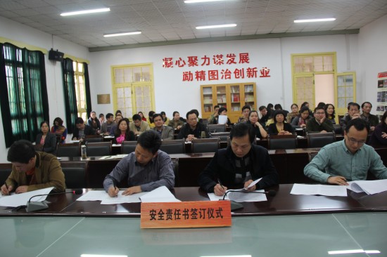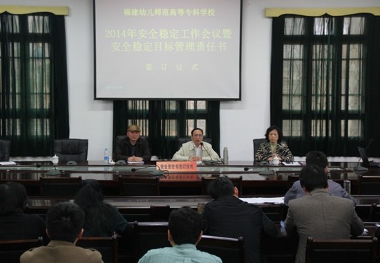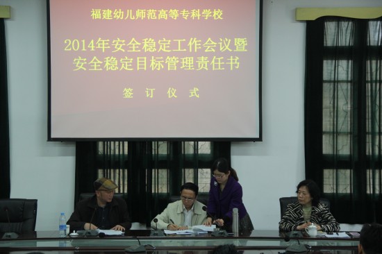王奕对我校2014年安全稳定工作作了解读,会上举行了安全稳定目标管理责任书签订仪式,林雨书记分别与分管副校长、各系、处(部)、附属单位负责人签订安全稳定工作目标管理责任书。