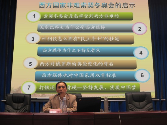 林雨书记从西方媒体种种非难索契冬奥会谈起,历数前苏联和俄罗斯在同西方国家博弈过程中跌宕起伏的发展历程,及西方媒体采用冷战思维、双重标准,"妖魔化"竞争对手的惯用伎俩。讲座通过深入浅出的解析,让广大师生认识到"打铁还需自身硬——要坚持发展,早日实现中国梦"的历史真理,进一步拓宽了视野,理清了思路。