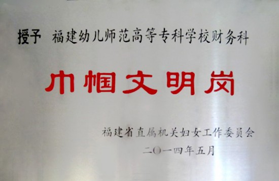 根据《福建省"巾帼文明岗"管理办法》(闽妇[2013]71号)精神,省直属机关妇女工作委员会采取自查和抽查相结合的方式,对111个"省直机关巾帼文明岗"和2012-2013年度新申报"省直机关巾帼文明岗"的创建集体进行考核检查,我校财务科被授予2012—2013年度"巾帼文明岗"荣誉称号;我校艺术系继续保留"巾帼文明岗"荣誉称号。