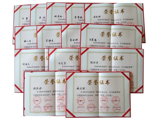 在由省文化厅、省教育厅等八部门联合开展的"阅读点亮心灵,学习成就梦想"阅读征文系列活动中,我校获"阅读推广突出贡献奖",陈桂莹等五位教师被授予"优秀辅导老师奖",由校图书馆、公共教学部组织推荐的学生参评作品获一等奖两名、二等奖三名、三等奖九名。