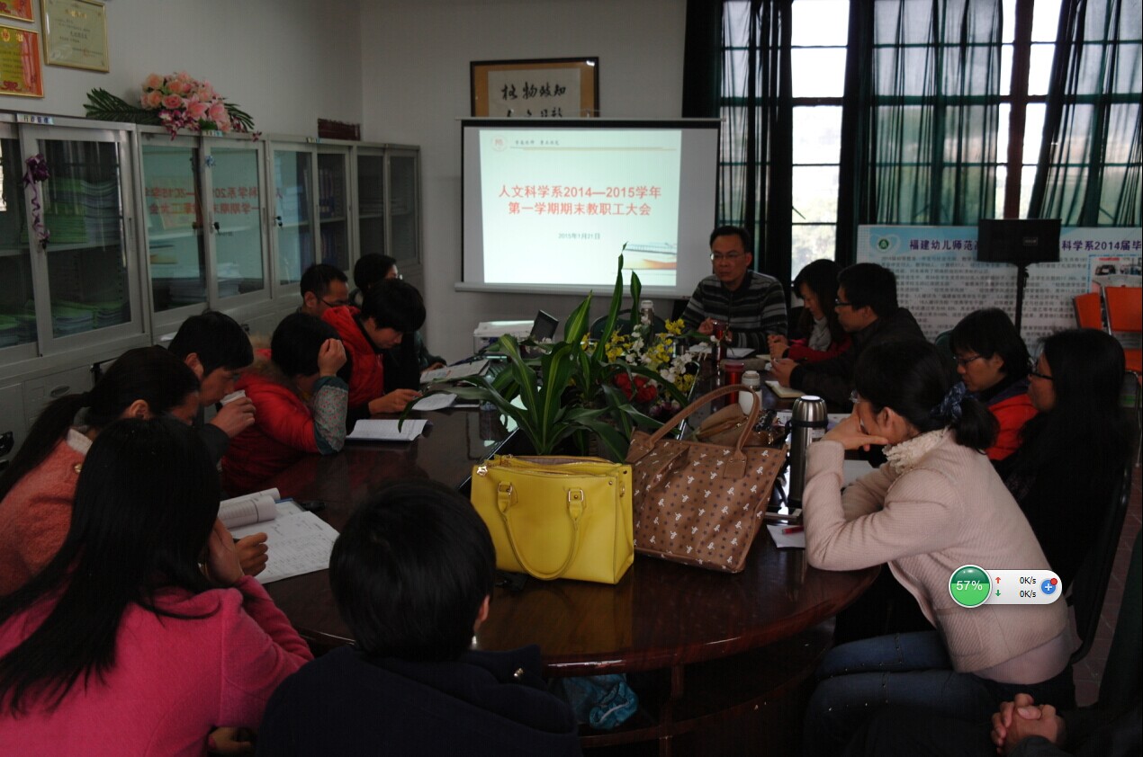 2015年1月21日下午,我系在系办601会议室举行人文科学系2014——2015学年第一学期期末教职工大会,会议由陈强主任主持。他对期末学校、系部开展的重要活动及重大事件做了反馈,强调了下学期、新一年的工作重点,对广大教职员工提出了新希望、新要求。