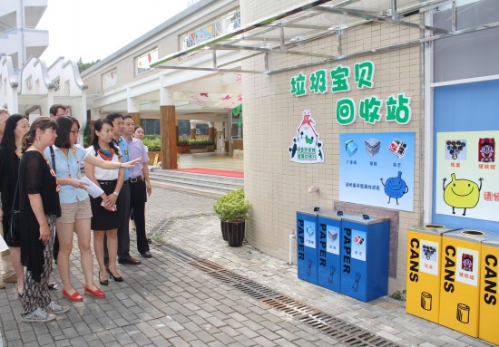 代表团一行参观了幼儿园户外环境和班级活动。幼儿园里,各班级种植的绿色小菜园、孩子们设计的环保标识和资源回收站受到了来宾的好评。各班级开展了富有特色的系列活动,小班举行亲子制作"垃圾宝贝变形记",中班开展"树木"环保活动和三坊七巷主题环境展示,大班进行科学探究,各班级活动较好的将环境教育融入到日常生活中。