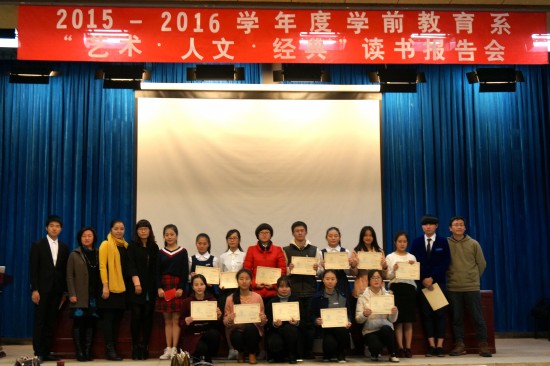 2016年元月7日,由公共教学部与学前教育系在图书馆四楼学术报告厅联合举办了2015-2016学年学前教育系"艺术•人文•经典"读书报告会。学前教育系2015级各班通过初赛推选13位选手参加本次报告会。本部陈桂莹、王佩雯和张航三位老师任评委。