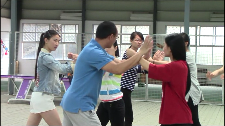 全胜老师在上微课"太极拳棚捋挤按在女子防身术中的应用"