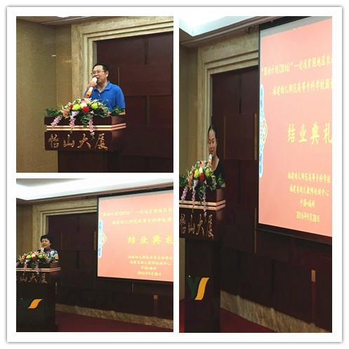 结业仪式在国培回顾短片中拉开帷幕,国培团队和学员们共同回忆25天以来的学习、生活的难忘时光。随后,鲍仕梅书记向国培班顺利结业的50名学员致辞祝贺,向9所影子研修基地幼儿园表达了真诚的谢意,肯定了我校培训中心的辛勤工作。我校附属第一幼儿园隋玉玲园长作为影子园导师代表发言,表达了与学员在15天影子研修相处中的深切情谊,赞赏了我校在国培课程设置与活动安排上的精心付出。来自广西罗城县的培训学员代表韦洁园长做了发言,表示通过此次培训,在专业知识上得到了的引领,教育理念得到更新,管理能力和实践技能得到提升,在之后的返岗实践中,她会带着满满的收获,回到幼教改革的最前沿,带动园所幼儿教师专业发展,推动幼儿园发展与创新。