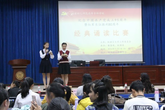 11月14日晚,庆祝中国共产党成立95周年暨红军长征胜利80周年经典诵读大赛总决赛圆满落幕,选手们用声情并茂的朗诵与现场观众一起重温红军长征的光辉历史,抒发激昂澎湃的爱国情怀,也展现了我校学生良好的朗诵艺术水平。