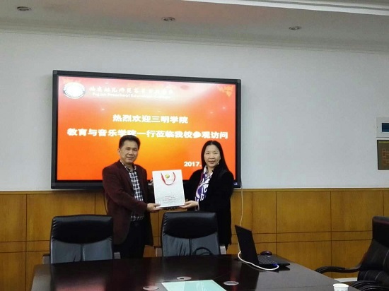 2017年3月20日上午,三明学院教育与音乐学院一行莅临我校参观访问,我校郑晓生副校长、学前教育系主任吴丽芳、邵宁副主任等陪同参访。