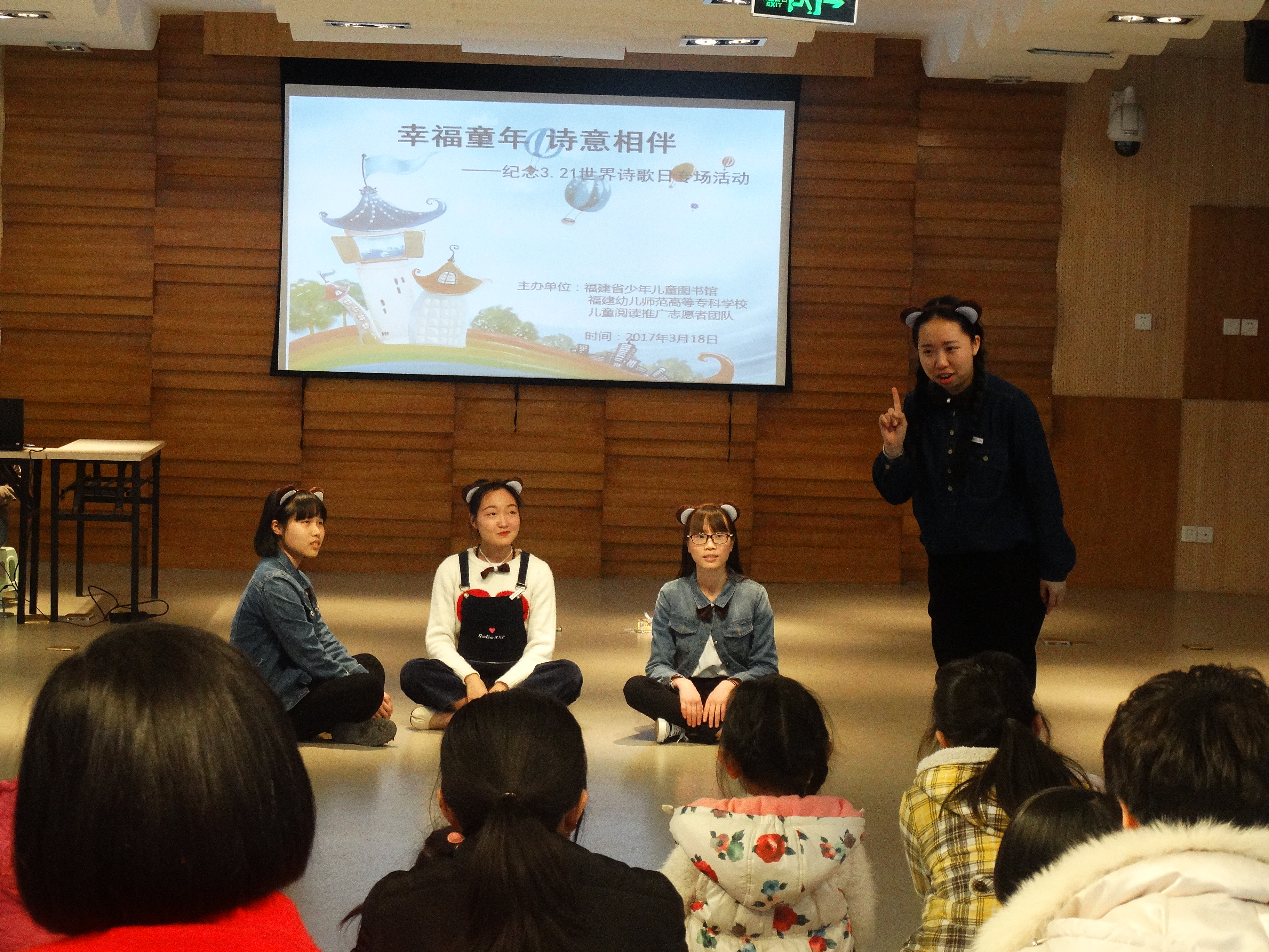 日前,我校"儿童阅读推广"团队与省少儿图书馆联合举办以"幸福童年,诗意相伴"为主题的3.21世界诗歌日专场活动。来自学前系、人文系的故事哥哥、故事姐姐表演了猴子捞月亮、拔萝卜、田鼠阿佛等自主创编的儿歌剧,组织小读者玩童谣游戏,与孩子和家长共同感受童心的律动,天籁的回响。