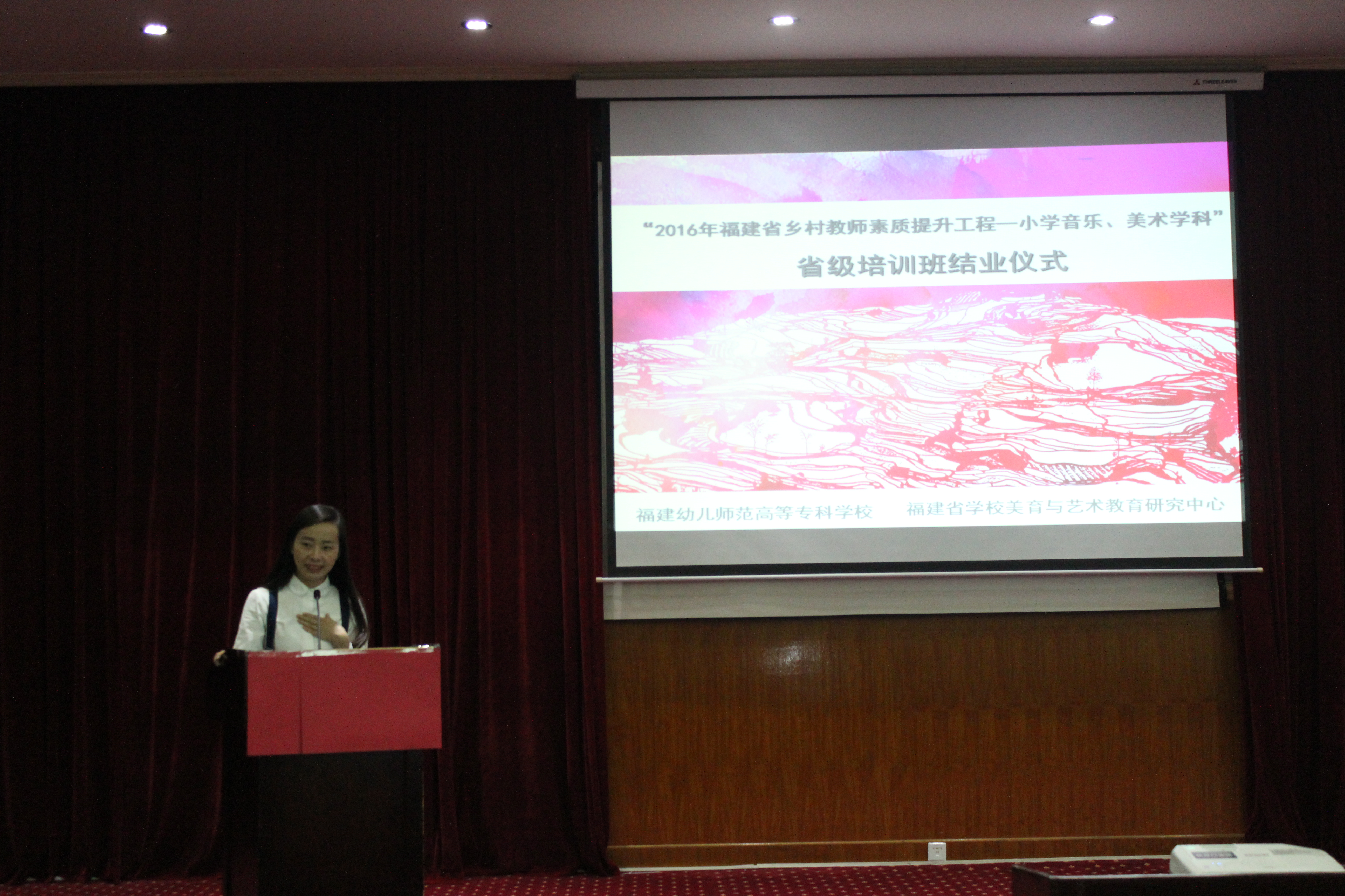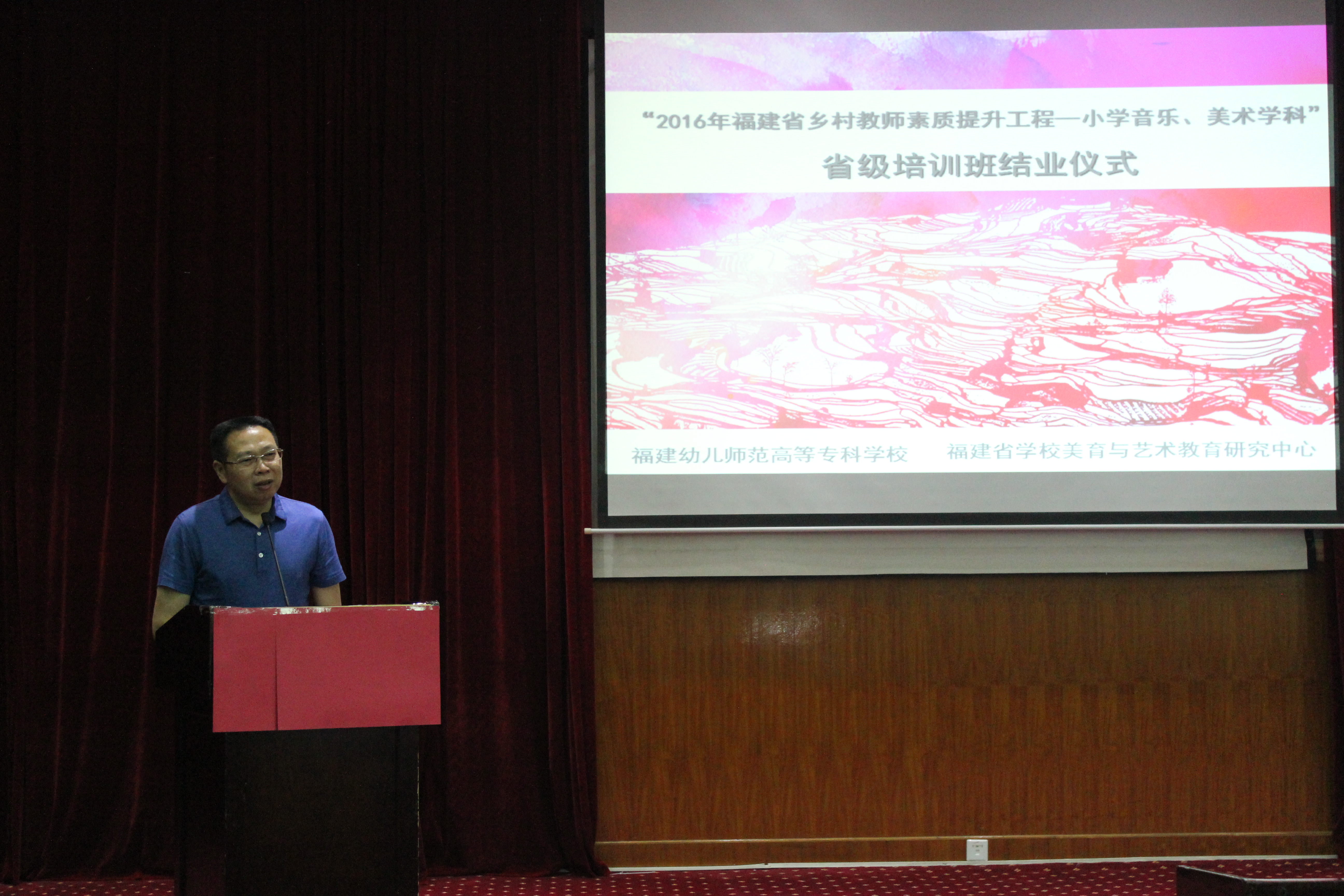 4月21日上午,我校在梅峰宾馆举行福建省乡村教师素质提升工程—小学音乐、小学美术学科省级培训班的结业仪式,结业仪式由校培训中心薛少红主任主持。校党委鲍仕梅书记、郑健成校长、福建省学校美育与艺术教育研究中心王福阳主任,校培训中心、艺术系领导,导师代表、学员等120余人参与了此次活动。福建省中小学教师继续教育指导中心邹开煌教授、林斯坦教授作为项目评估测评专家,也莅临现场。