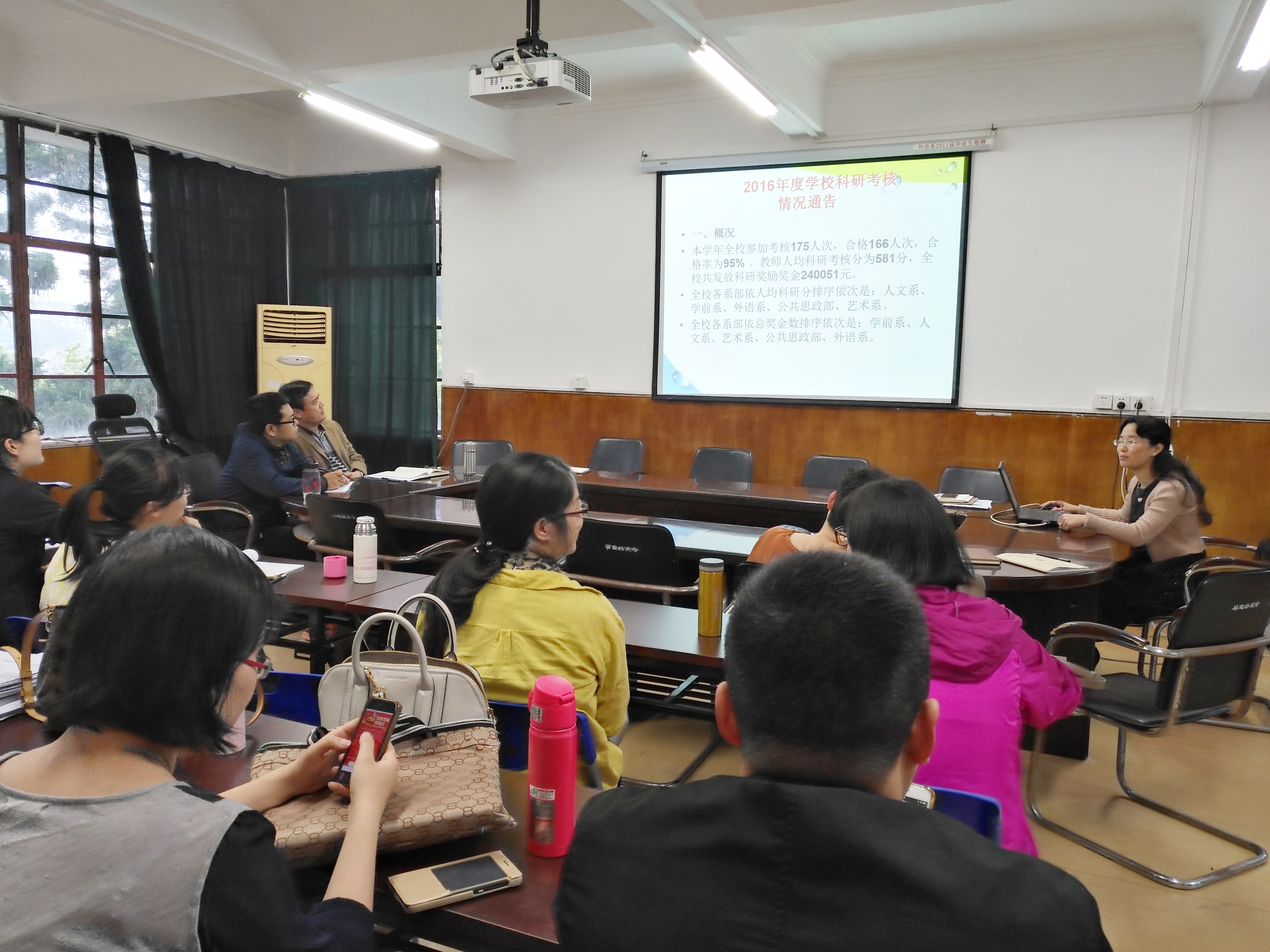 在第一项议程上,林榕副主任传达了《福建省高校深化落实中央八项规定精神"1+X"专项督查暂行办法》的文件精神;第二项议程中,林榕副主任对我系2016度科研工作进行了全面总结,她用客观的数据和理性的分析,为我系科研工作精准把脉,清晰地呈现了上一年度工作中的亮点和不足,明晰了下一阶段努力的目标和前进的方向;最后一项议程上,林榕副主任强调了规范使用科研经费的重要性,细致解读了学校科研经费报销项目和报销流程。