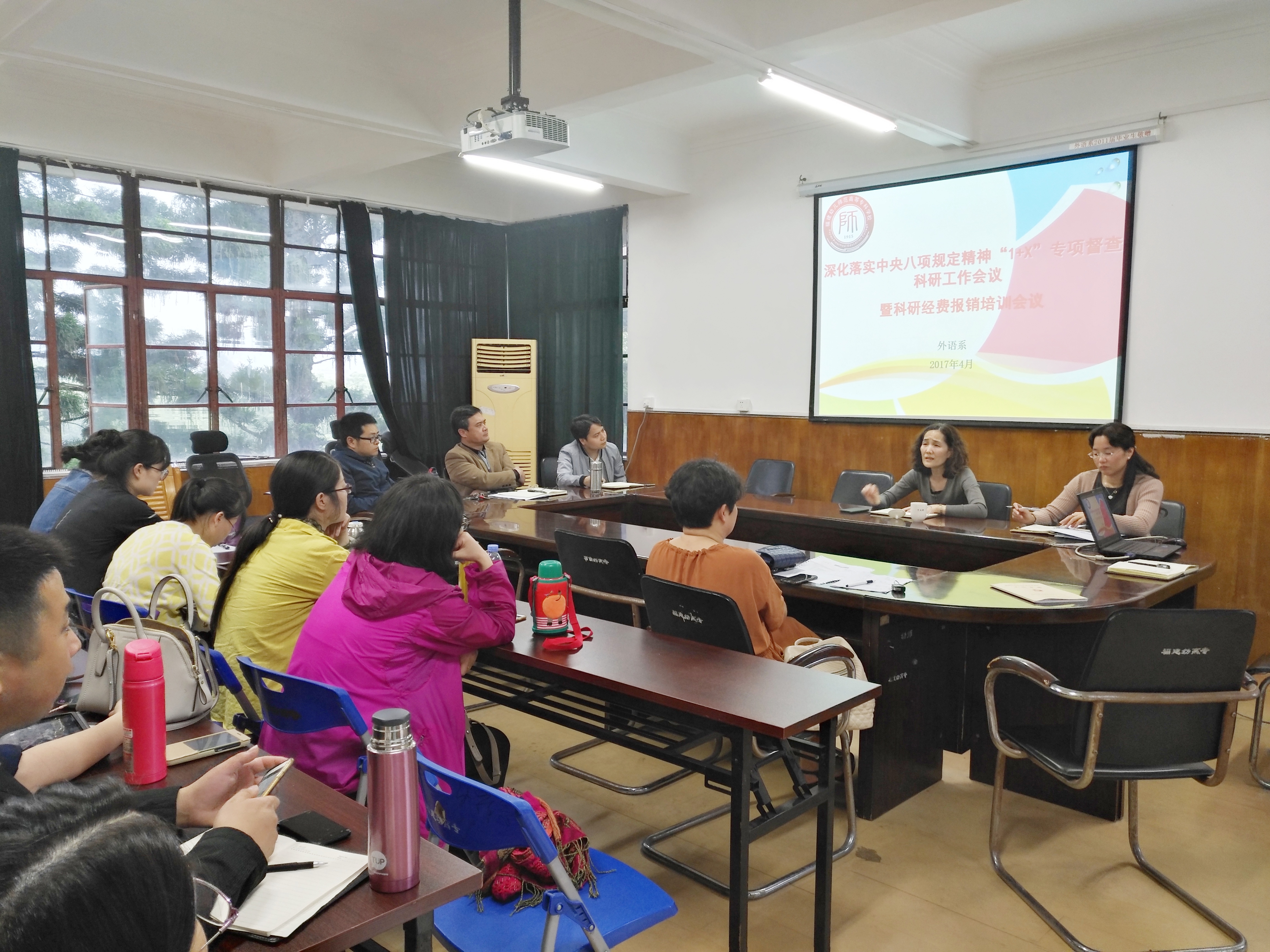 4月21日下午,我系组织全系教师召开科研工作会议。会议由系副主任林榕老师主持。主要议题为:传达《福建省高校深化落实中央八项规定精神"1+X"专项督查暂行办法》文件精神、总结2016年度科研工作和科研报销培训。
