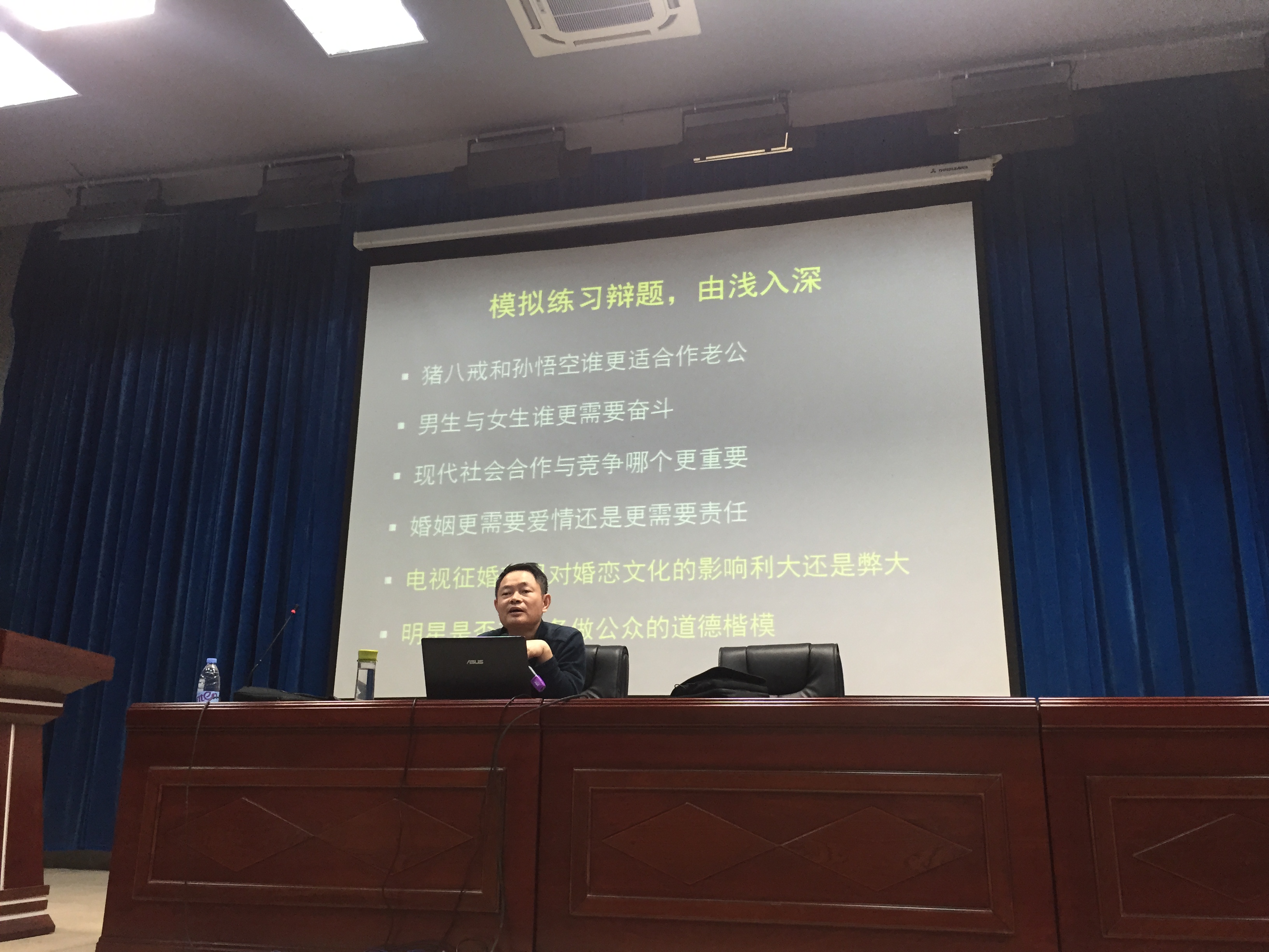 讲座由思政部主任伊文婷教授主持,思政部全体教师与校辩论爱好者们以极高的热情学习聆听了陈志老师的讲座。陈志专家用幽默的语言调动现场气氛,与辩论社员进行了良好的互动,并针对我校五月份辩论赛的辩题就双方立场进行分析,给各系部辩论队员进行指导。陈志教授的讲座让大家深入了解了辩论的技巧与方法,尤其是在队员的选拔与辩题的立论方面受益匪浅。