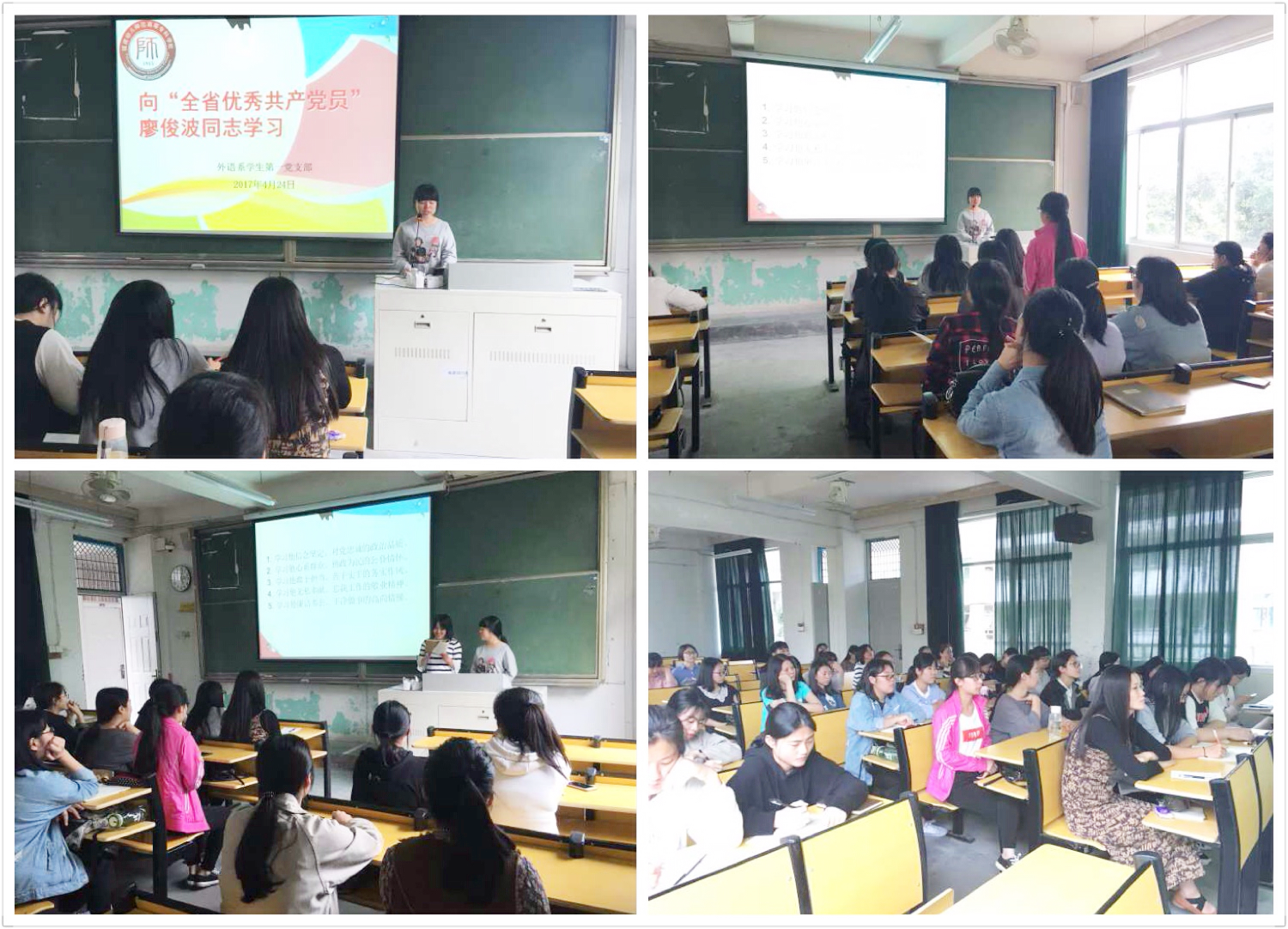 在党总支组织学习的基础上,4月24日下午,我系学生第一党支部进一步组织全体入党积极分子在教学楼A202开展向"全省优秀共产党员"廖俊波同志学习的理论学习活动。