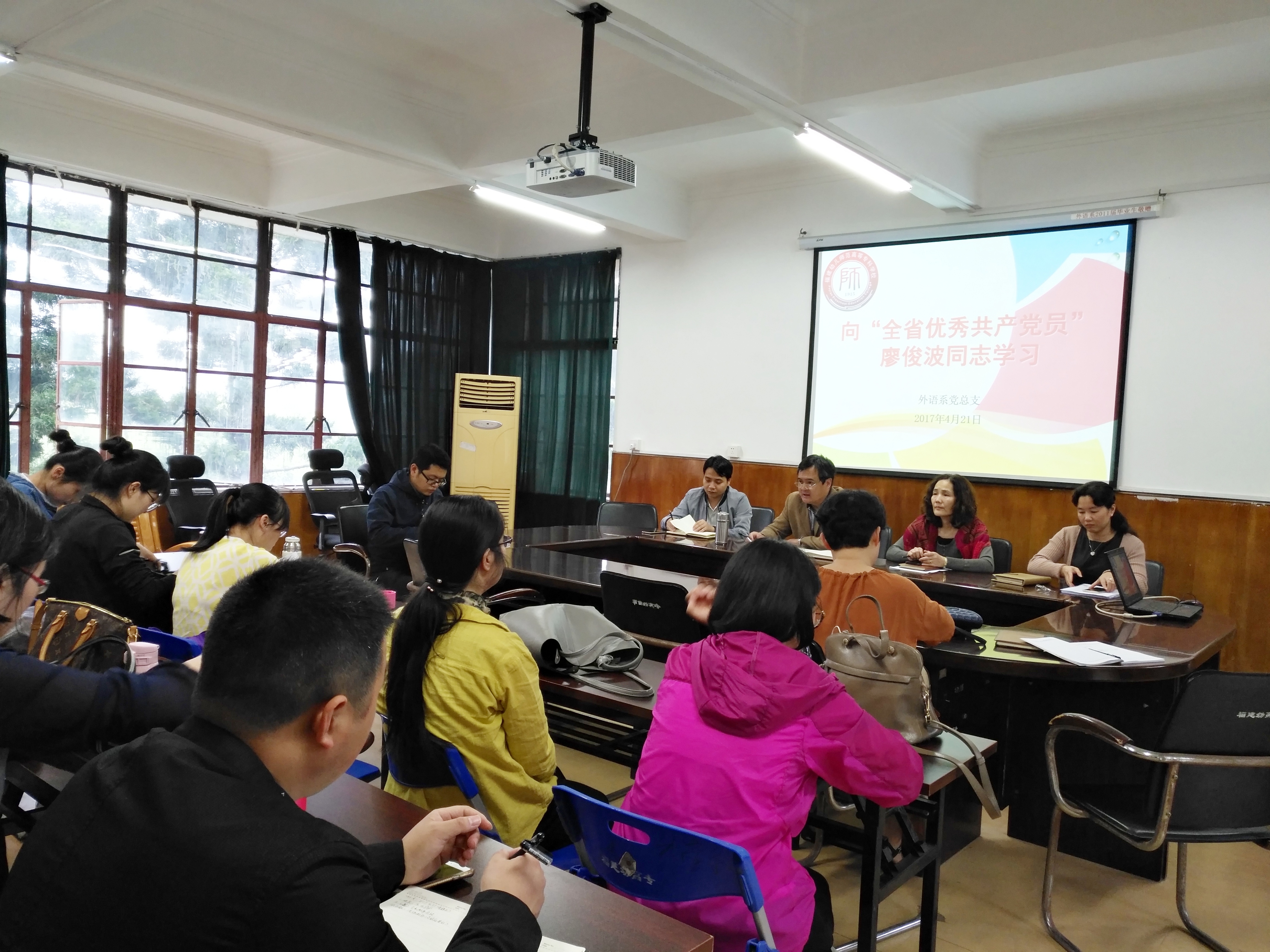 4月21日下午,我系党总支组织全体党员于系办306开展向"全省优秀共产党员"廖俊波同志学习的政治理论学习活动。系党总支书记林祥昊同志主持了本次学习。