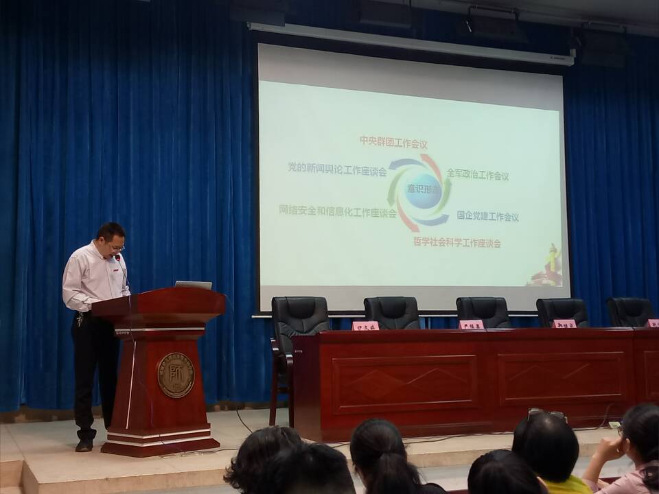 4月25日晚,校党委书记鲍仕梅在图书馆学术报告厅为我校马列经典著作读书社社员、校党训班学员上了一堂生动的"形势与政策"课,思政部全体教师到场旁听。
