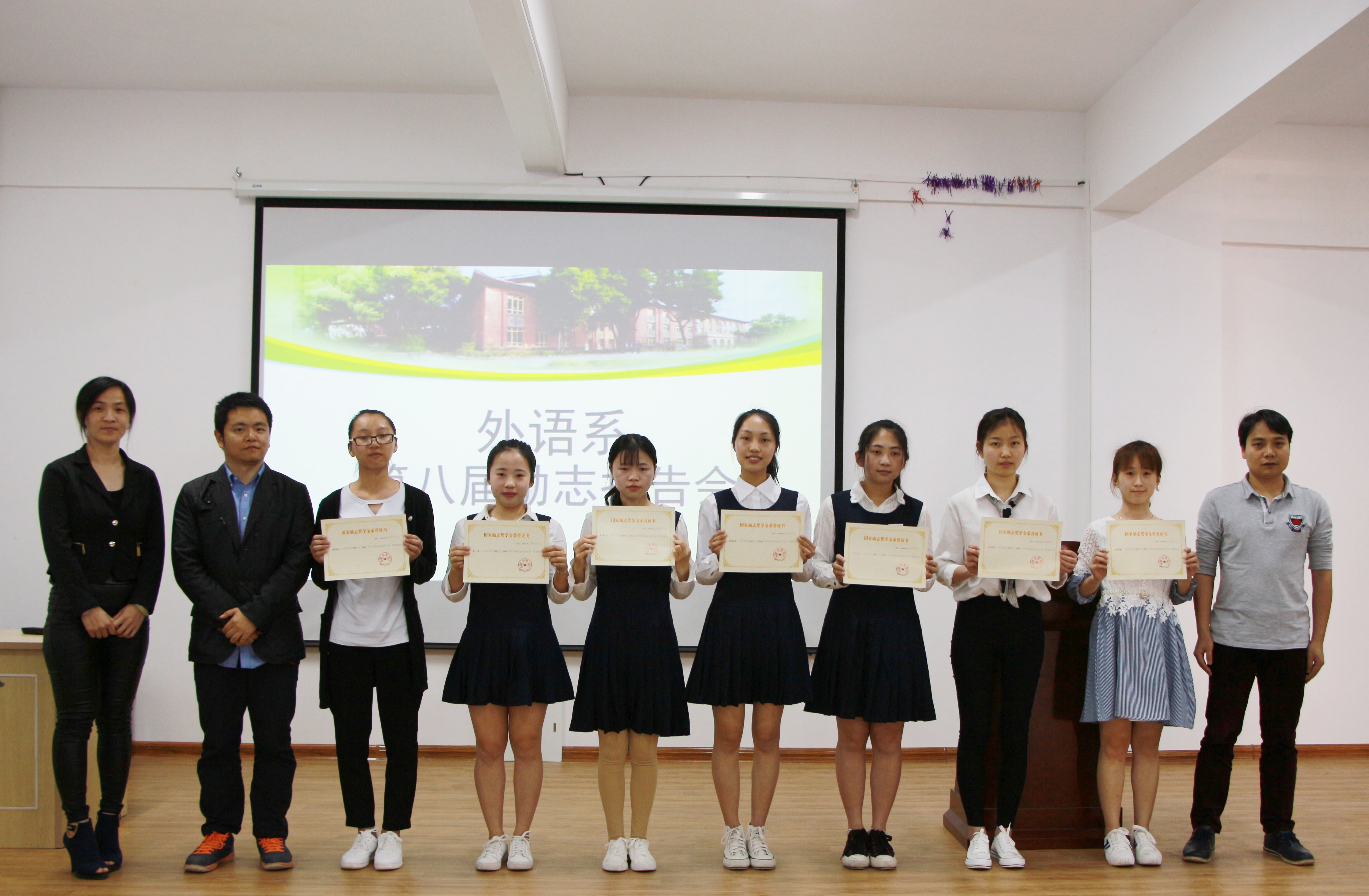 四位同学演讲结束后,我系为今年获得国家励志奖学金的同学们统一颁奖并合影。胡华荣副书记在随后的发言中勉励在座同学,"有梦想的人,起点并不重要,奋斗目标和终点才是重要",并希望在座的同学们能"常怀感恩之心",并规划好成长目标和轨迹,明确学习目标,努力成为有知识、有学问的专业人才,不断增强综合素质和实践能力,不断追求卓越,努力成为社会栋梁,感恩社会、回馈社会,为祖国的基础教育贡献自己的绵薄之力。