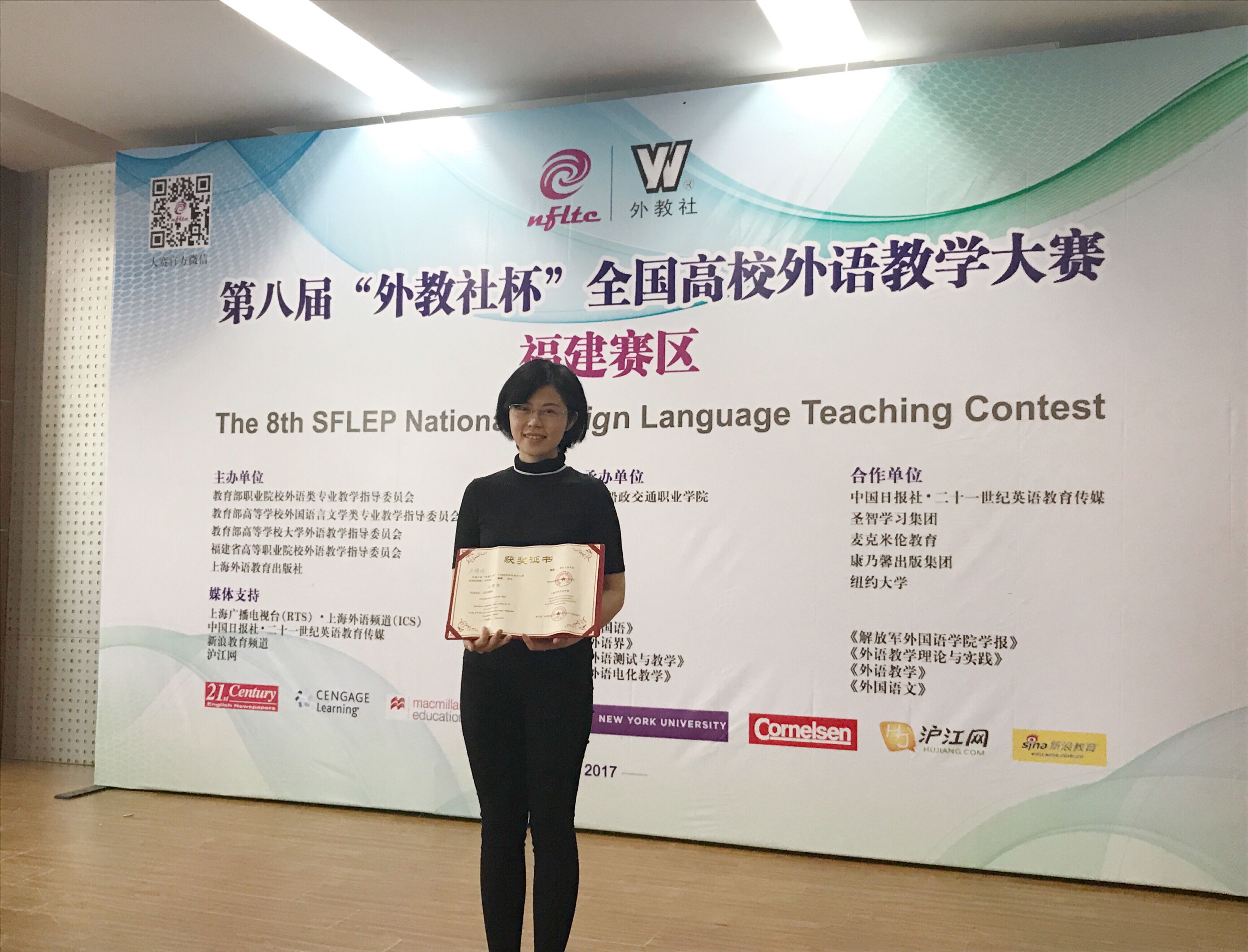 经过激烈角逐,我校外语系教师王旖旎充分展示了高职院校教师的专业技能,在第八届"外教社杯"全国高校外语教学大赛(职业院校组)中荣获福建赛区二等奖。