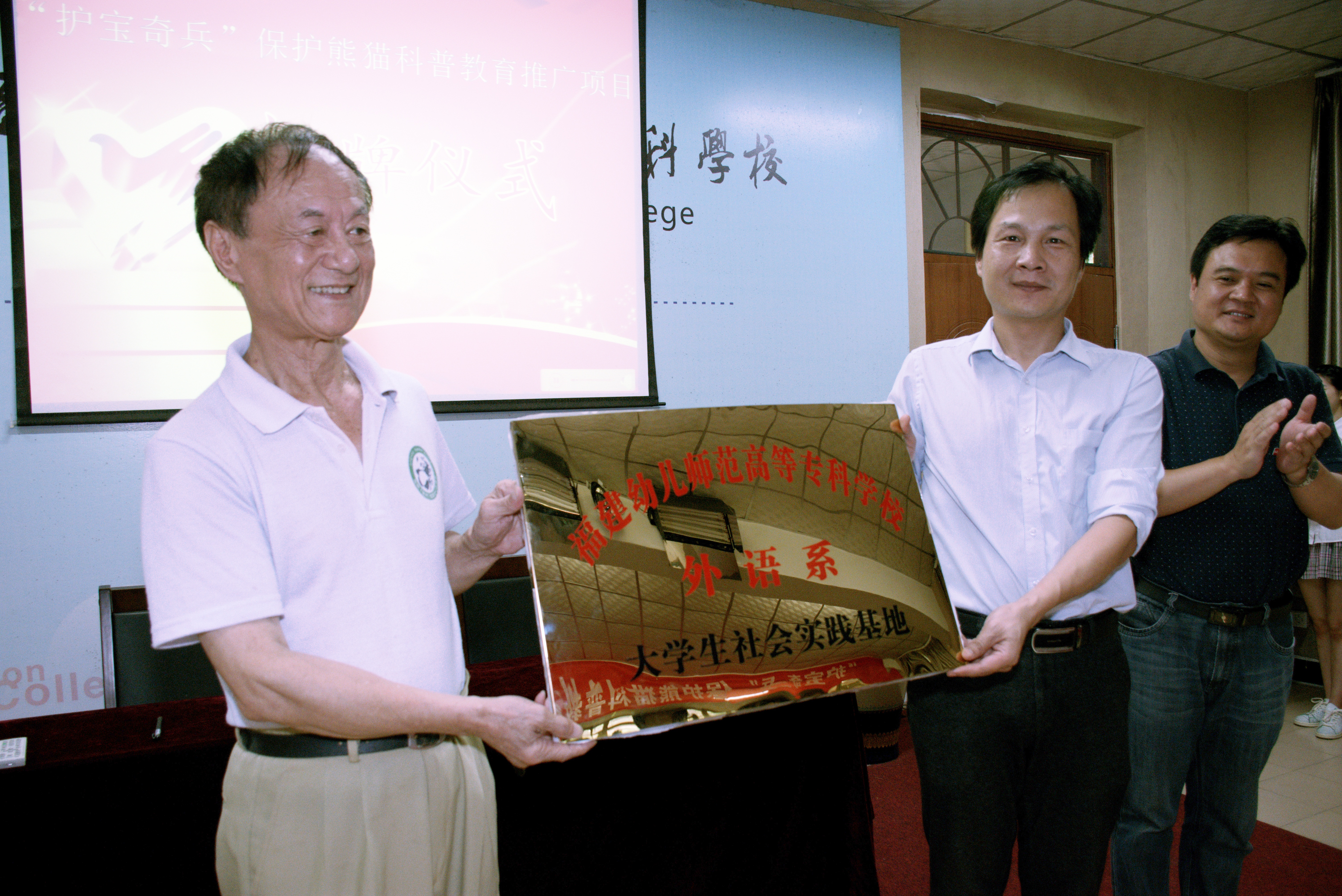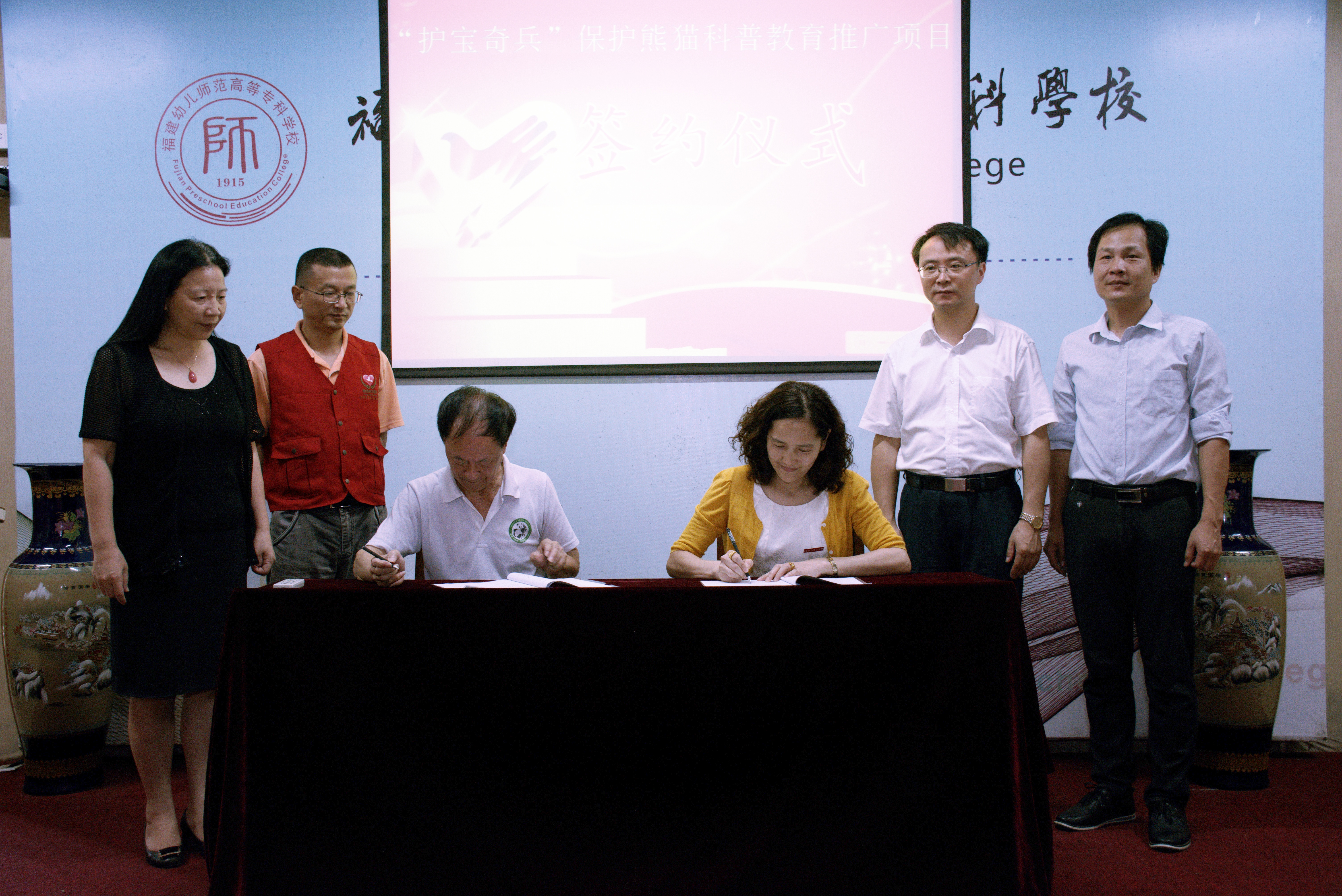 启动仪式过程中还开展了项目合作协议签订仪式,福建幼儿师范高等专科学校外语系主任丁天华教授与海峡(福州)熊猫世界陈玉村主任代表合作双方签订项目合作协议,在场校领导和橄榄树志愿者团队领导共同见证了协议签订过程。在随后进行的大学生社会实践基地授牌仪式上,出席仪式的校党工部黄晖部长、系党总支林祥昊书记共同为海峡(福州)熊猫世界实践基地授牌,出席会议的全体领导共同为志愿者代表颁发了项目聘书。随着郑晓生副校长宣布项目正式启动,全场响起热烈的掌声,标志着"护宝奇兵"保护熊猫科普教育推广项目正式落地。