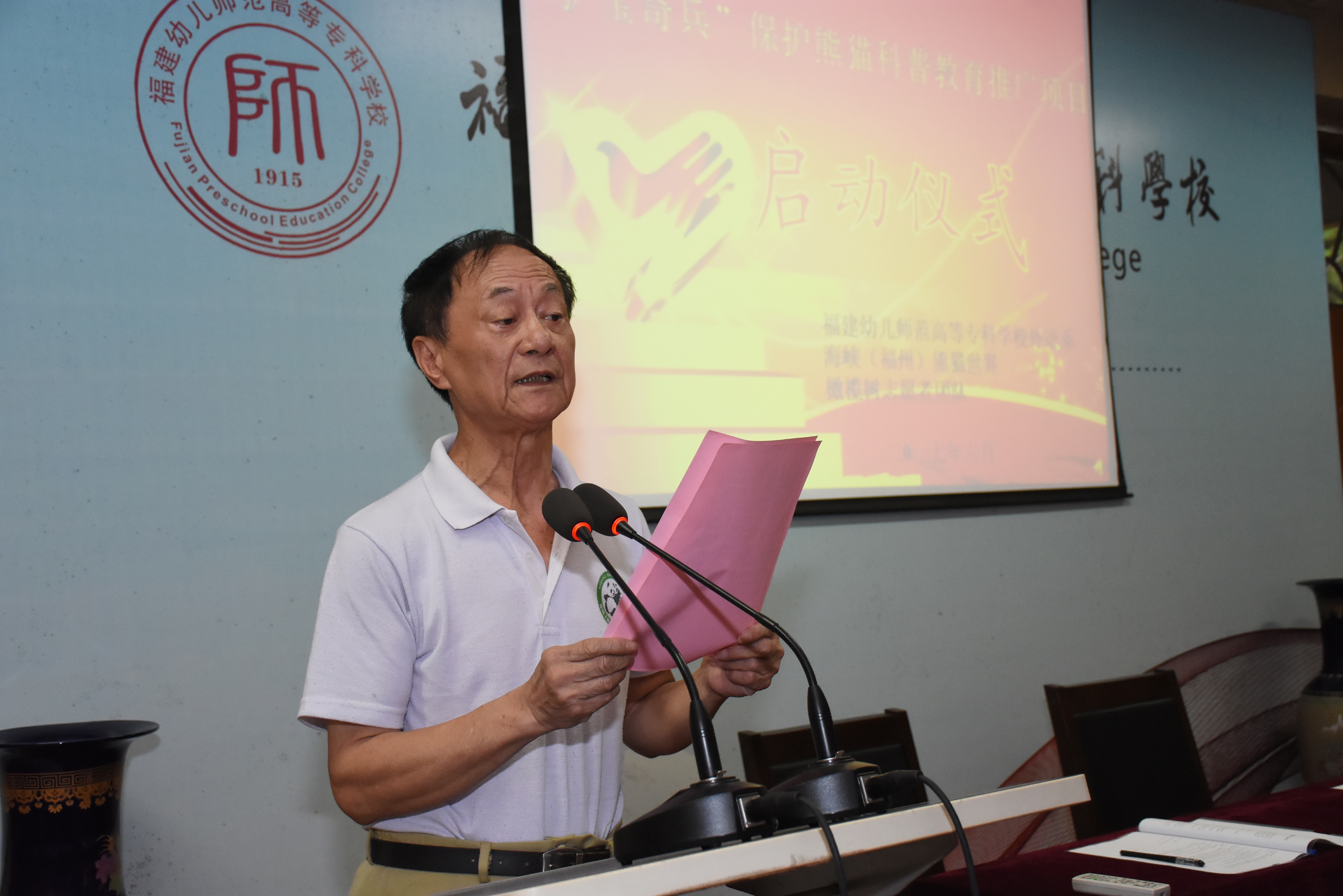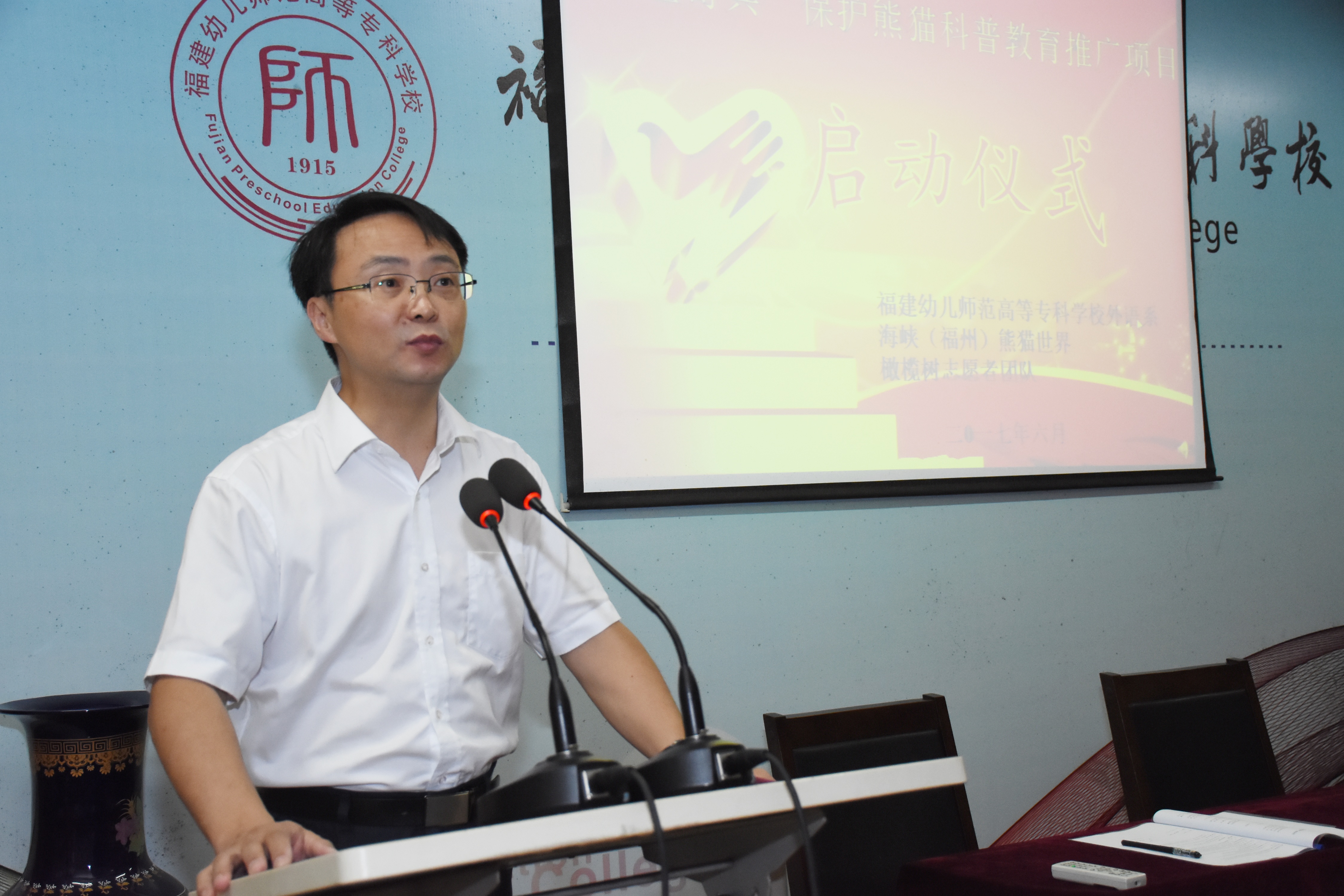 为进一步提升我系学生师德素养、夯实学生专业技能、拓宽学生社会实践平台。6月6日上午,福建幼儿师范高等专科学校外语系联合海峡(福州)熊猫世界以及橄榄树志愿者团队在校办101举办"护宝奇兵"保护熊猫科普教育推广项目启动仪式。海峡(福州)熊猫世界研究交流中心主任陈玉村,橄榄树志愿者团队理事长林向荣,校党委副书记、纪委书记,副校长郑晓生,校党工部部长黄晖,学工部部长严桂泉,团委书记唐川,外语系主任丁天华、党总支书记林祥昊、副主任林榕出席本次启动仪式,来自我系八十多名青年志愿者参与活动,仪式由系党总支副书记胡华荣主持。