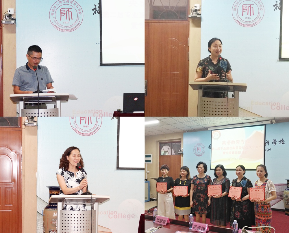 会上,温永选处长宣读了《福建幼儿师范高等专科学校关于成立第二届英语教育专业建设指导委员会的通知》。紧接着,郑健成校长发表致辞,她对专业委员会的成立表示祝贺,介绍了英语教育专业的发展历程,强调了英语教育专业委员会成立对专业建设、人才培养的重要意义,并提出殷切期望:希望专委会能够创新人才培养模式,主动灵活地适应社会需求;希望在学生实践和人才培养工作上加深校企合作,使专业人才培养更符合时代与社会的需求。福州市台江教师进修学校正校级督学陈育平老师也发表讲话,她诚挚感谢福建幼儿师范高等学校提供这一良好平台,使得校企双方得以加深合作,并表示甘为人梯,愿为基础教育的师资培养做贡献。最后,学校领导向委员们颁发聘书。