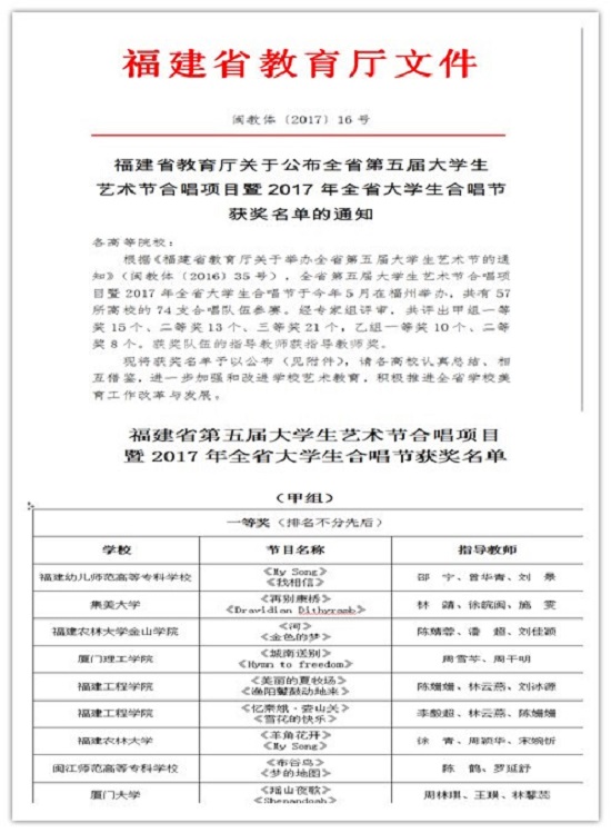 2017年5月17日在福建师范大学旗山校区举办了由福建省教育厅主办的福建省第五届大学生艺术节合唱项目暨2017年全省大学生合唱节决赛,全省共有57所高校的74支合唱队伍参与比赛。