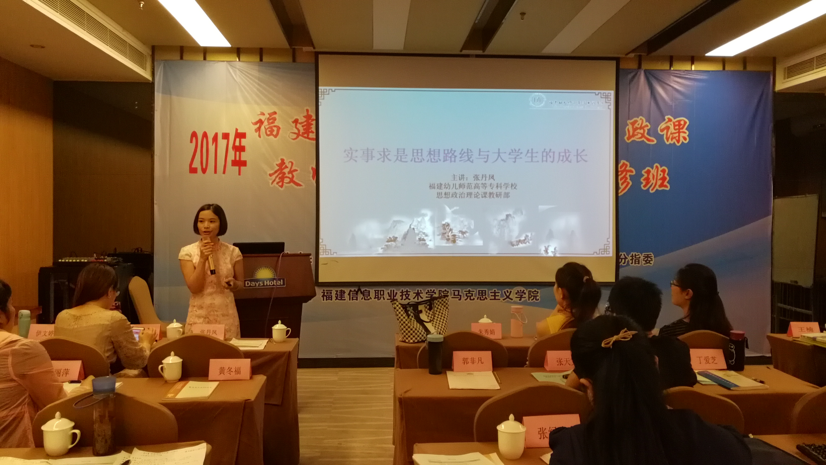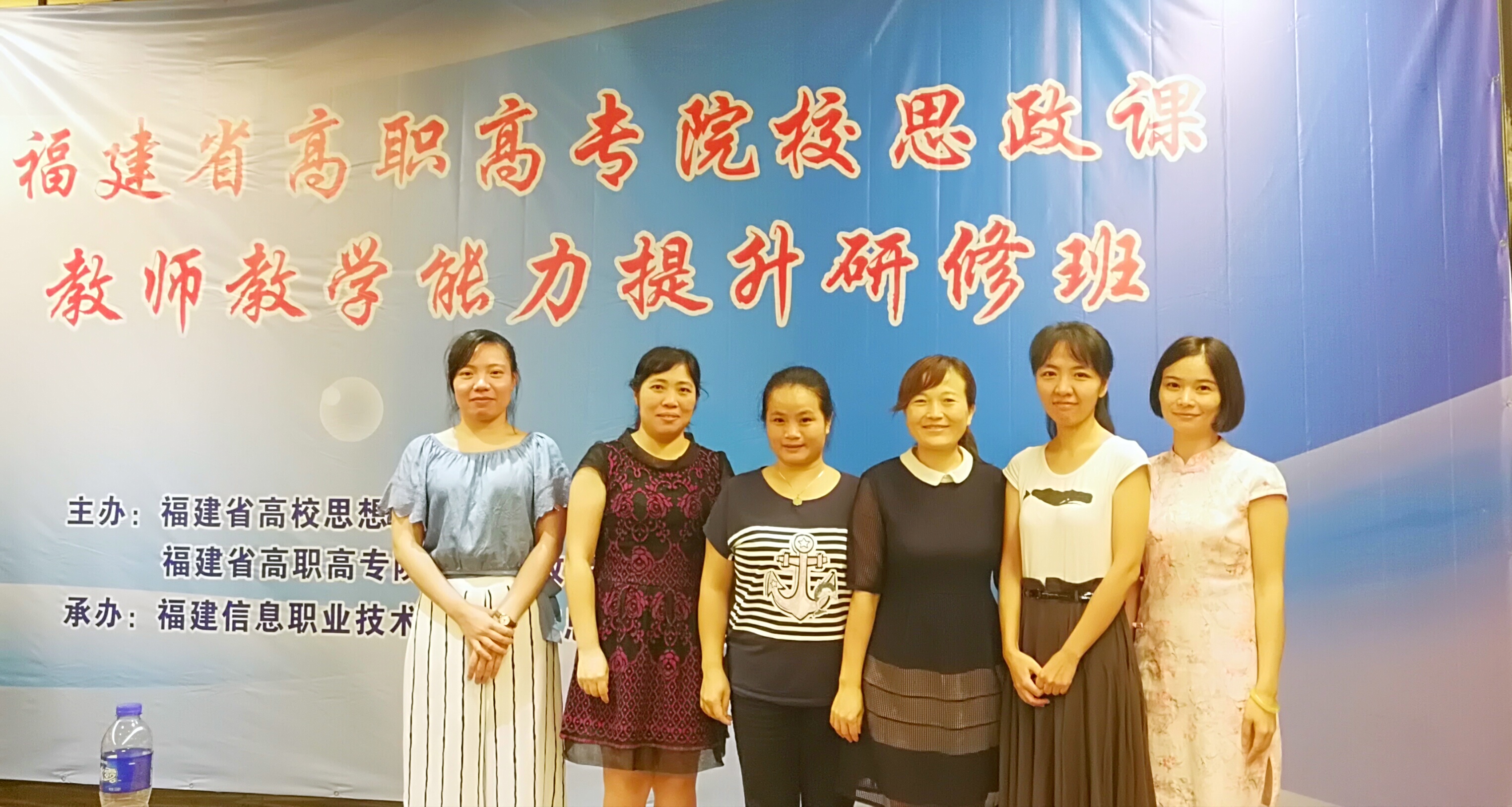 2017年7月17日至21日,思政部全体教师在思政部主任伊文婷教授的带领下参加了福建省高职高专院校思政课教师教学能力提升研修班。此次研修班由省高校思政理论课教学指导委员会高职高专分委会和省高职高专院校思政理论课建设联盟共同举办,由福建信息职业技术学院承办。本次研修内容包括《概论》课、《基础》课两门课程设计与教学辅导及教育部、省教工委听课专家推荐省内外优秀教师课程教学展示等。
