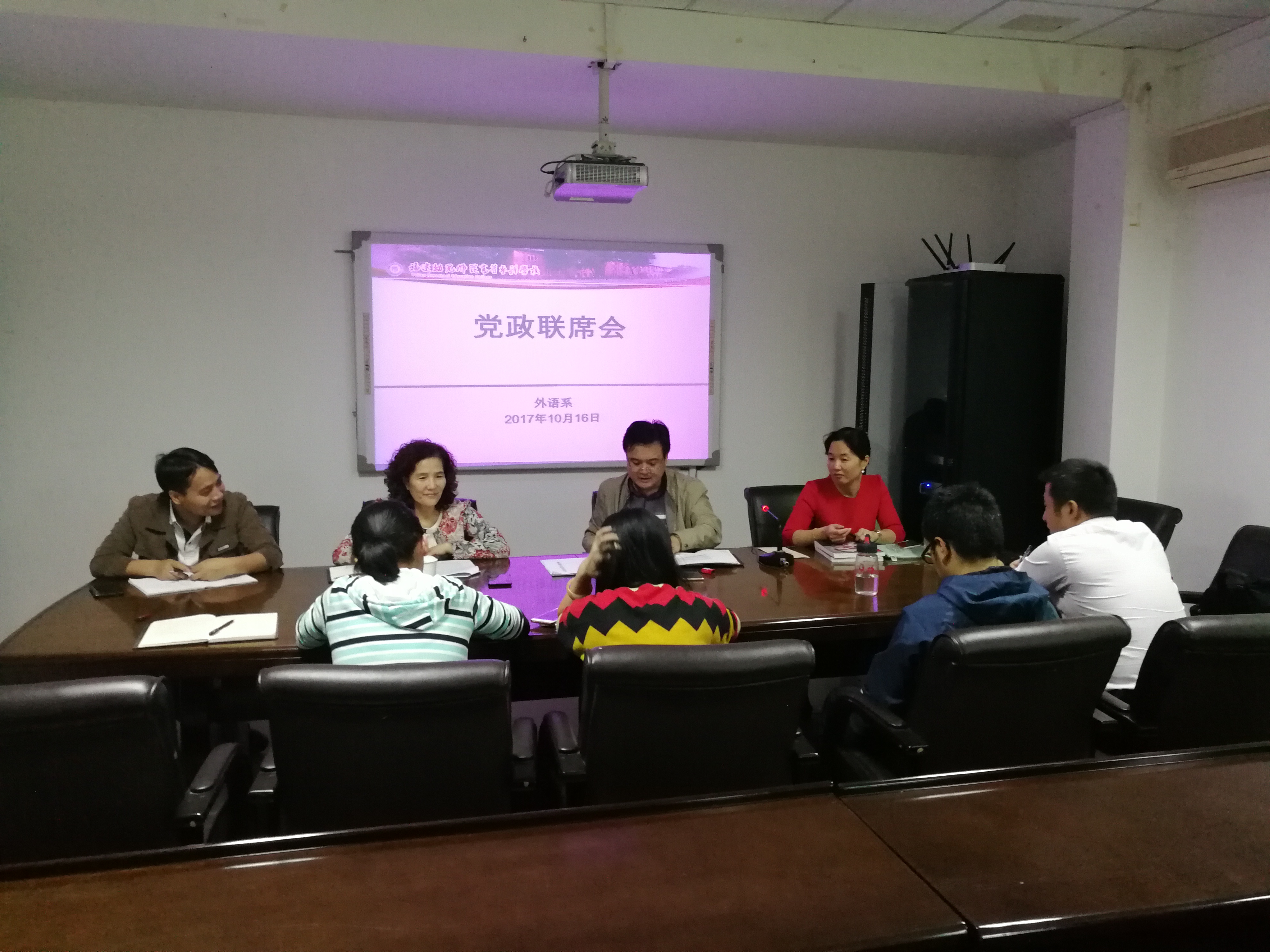 此次会议是我系顺利完成搬迁入驻金山校区后召开的第一次党政联席会,林祥昊书记传达了学校主要领导对系领导班子和全系教师在搬迁工作中能以大局为重、齐心协力、克服困难,出色完成搬迁工作的肯定和表扬,对外语系各项工作提出要有新思路、新举措、力争取得新成果的殷切期望。