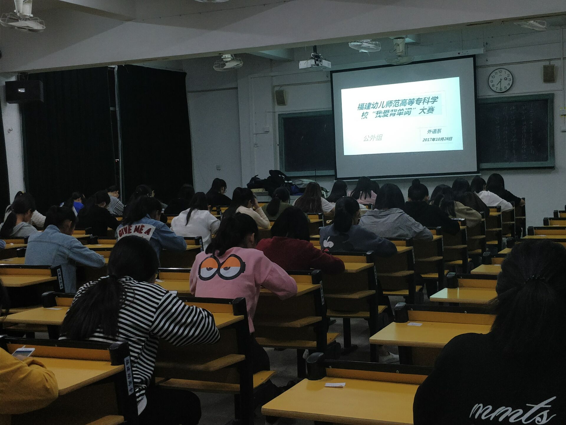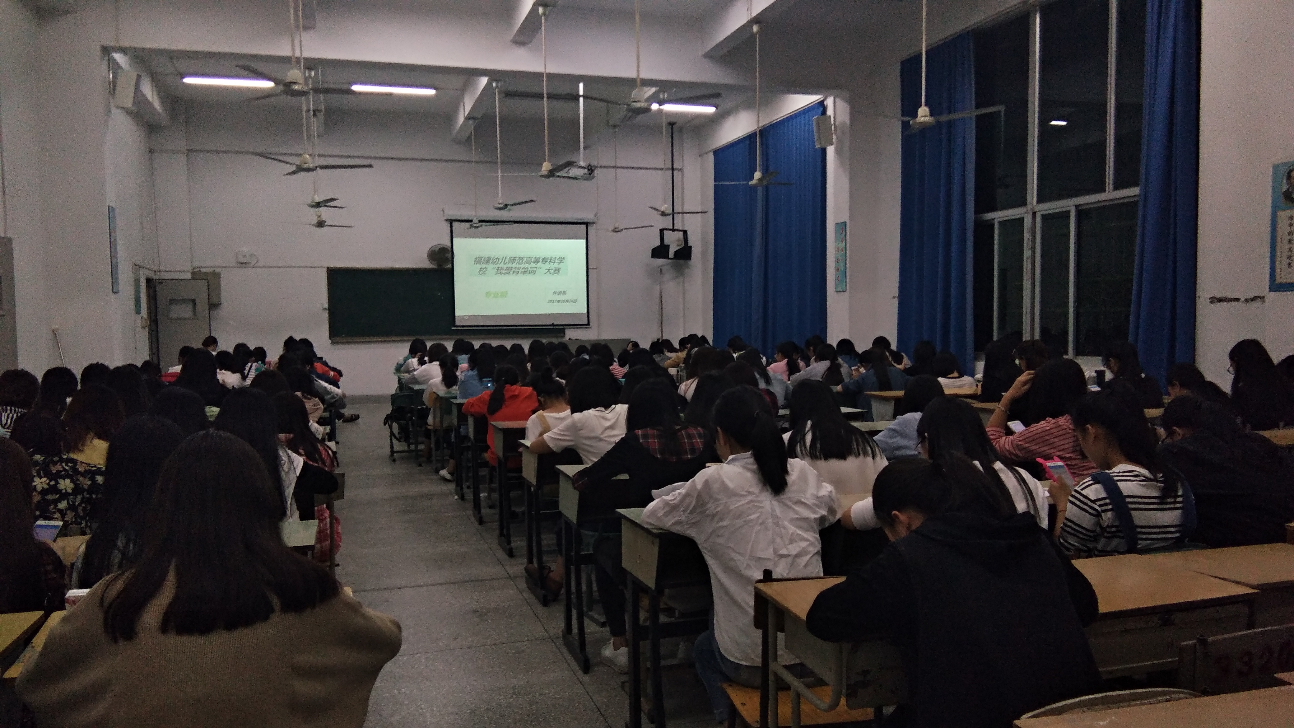 为深化我校数字化英语教学方法和学习方法的改革,改变学生传统的词汇学习方式,提高学生的学习效率,加强学生对词汇等英语基础知识和基本技能的掌握,同时为即将举行的福建省第二届英语词汇大赛(福建省大学外语教学研究会和高等教育出版社举办)选拔参赛选手,10月26日晚上7点30分,外语系举办了全校第二届"我爱背单词"大赛。此次比赛分专业组和公外组,覆盖仓山、白马、金山三个校区,采用在指定考场用手机扫二维码的方式进行,这是我校在英语教学改革中推行网络化测试的又一次大胆尝试。比赛选手都来自2016级、2017级,外语系271人参加了专业组的比赛,同时,有417名非英语专业的学生报名参加了公外组的比赛。