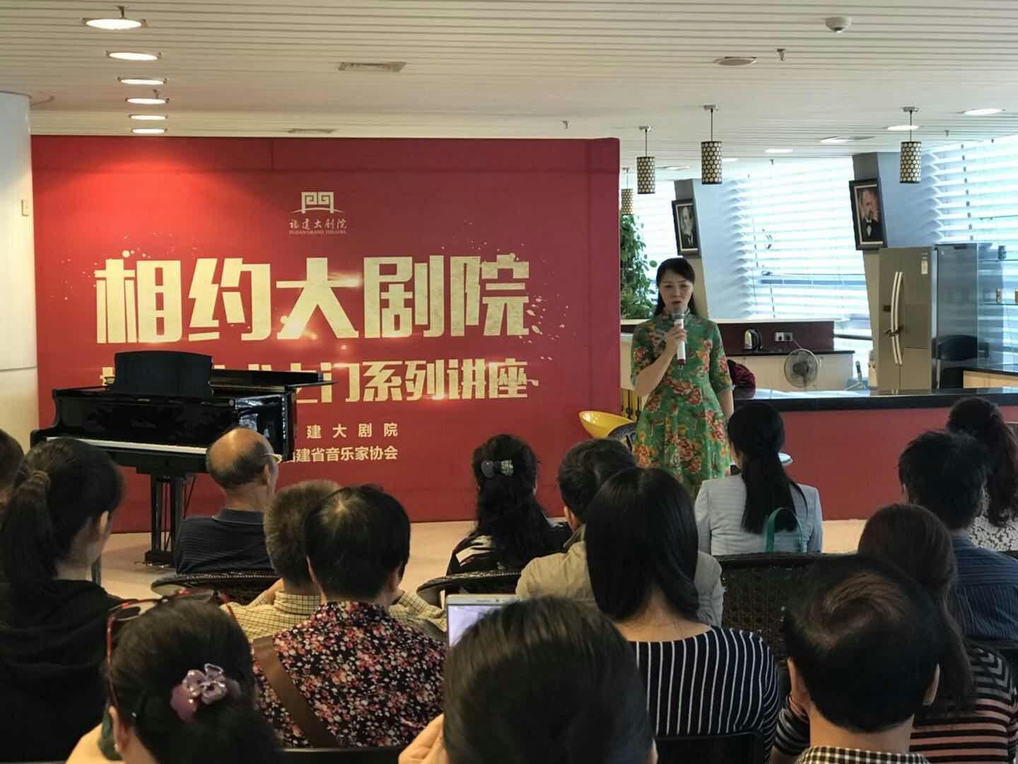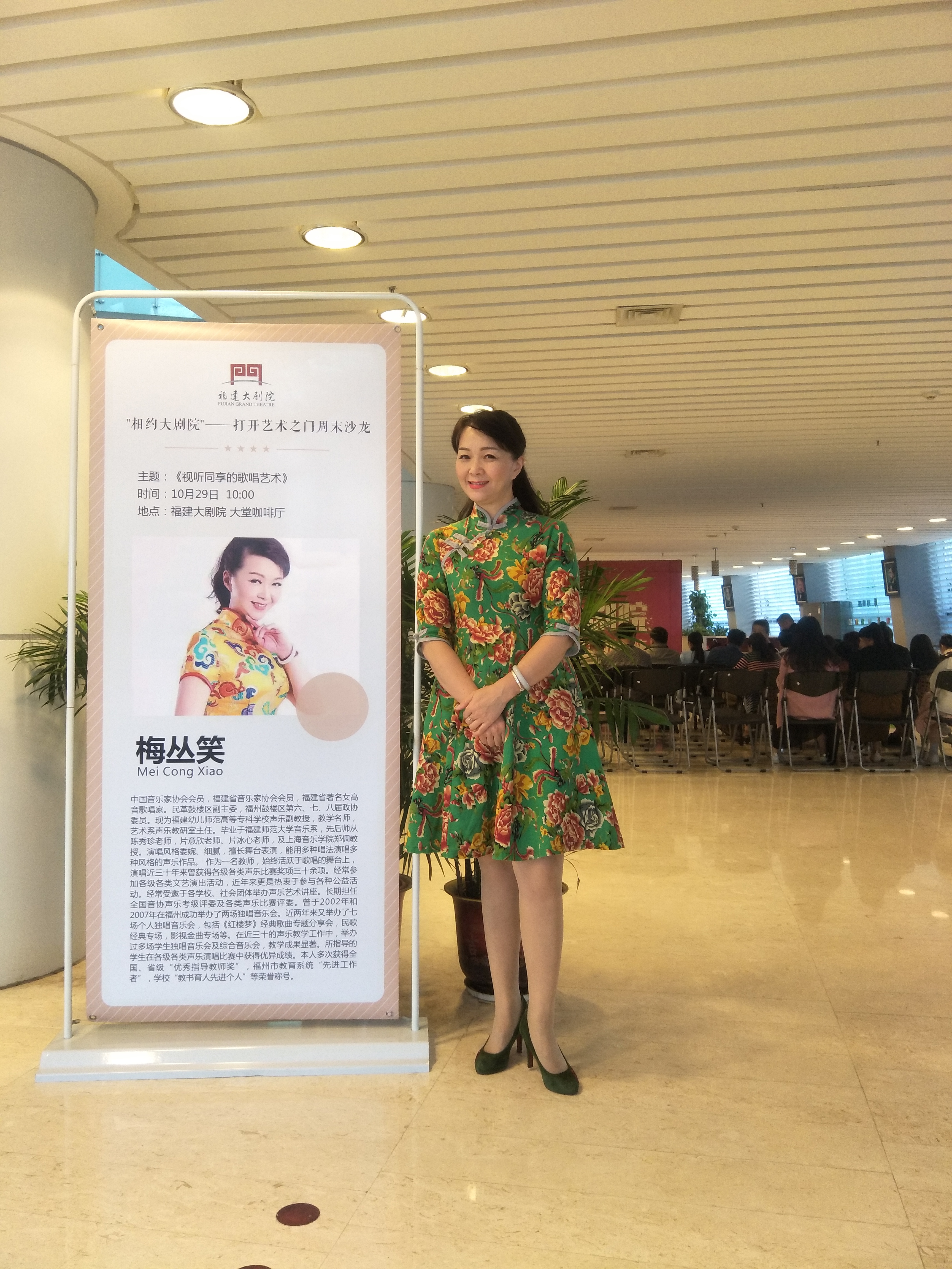 10.29日上午,福建幼儿师范高等专科学校艺术系声乐教研室主任、女高音歌唱家梅丛笑副教授,受邀在福建大剧院开设《视听同享的歌唱艺术》公益讲座,讲座受到了市民朋友的热烈欢迎。本次讲座是福建省大剧院举办的"打开艺术之门"系列艺术活动之一,旨在普及艺术,让生活艺术化,让艺术生活化,使更多的普通市民在周末的闲暇时光中感受艺术,领悟歌唱艺术与众不同的魅力,在艺术熏陶中提升审美素养与审美情趣。