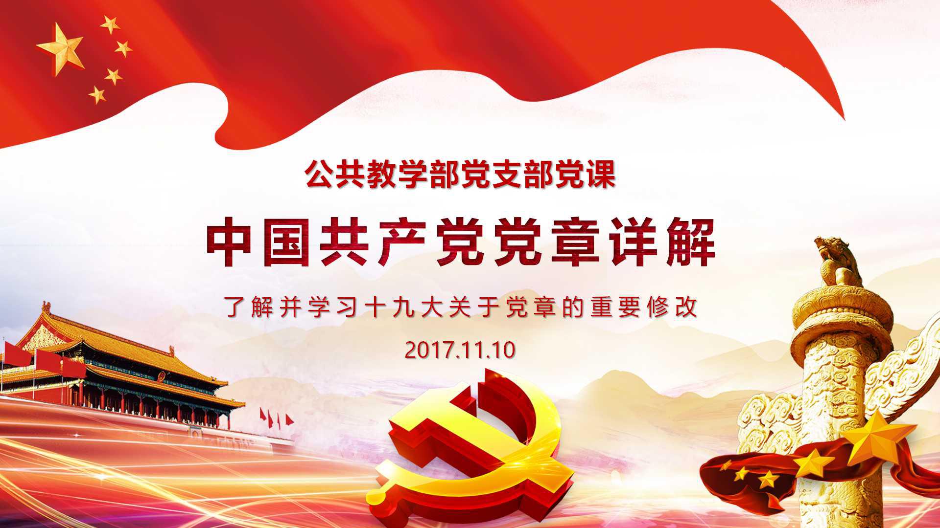 11月10日下午,公共教学部党支部召集全体党员开展"关注十九大中国共产党党章修改"专题党课,集中学习十九大有关党章修改的内容。专题党课由党支部张航书记主讲。