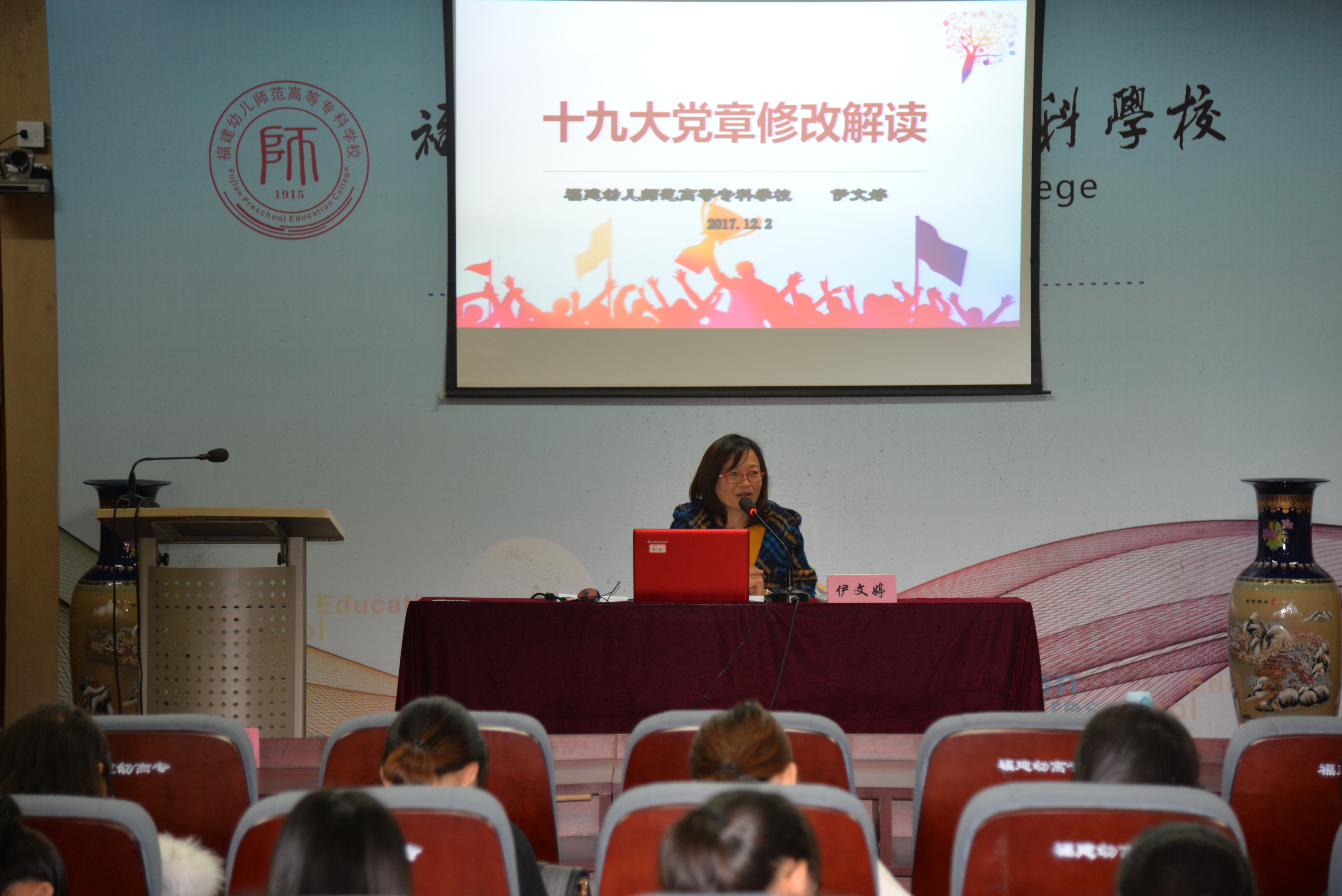 12月2日上午,我校党校第八期预备党员培训班、第二十期发展对象培训班暨学习宣传贯彻党的十九大精神专题培训正式开班。开班仪式后,马克思主义学院院长伊文婷教授为发展对象、预备党员专题解读党的十九大通过的新党章。