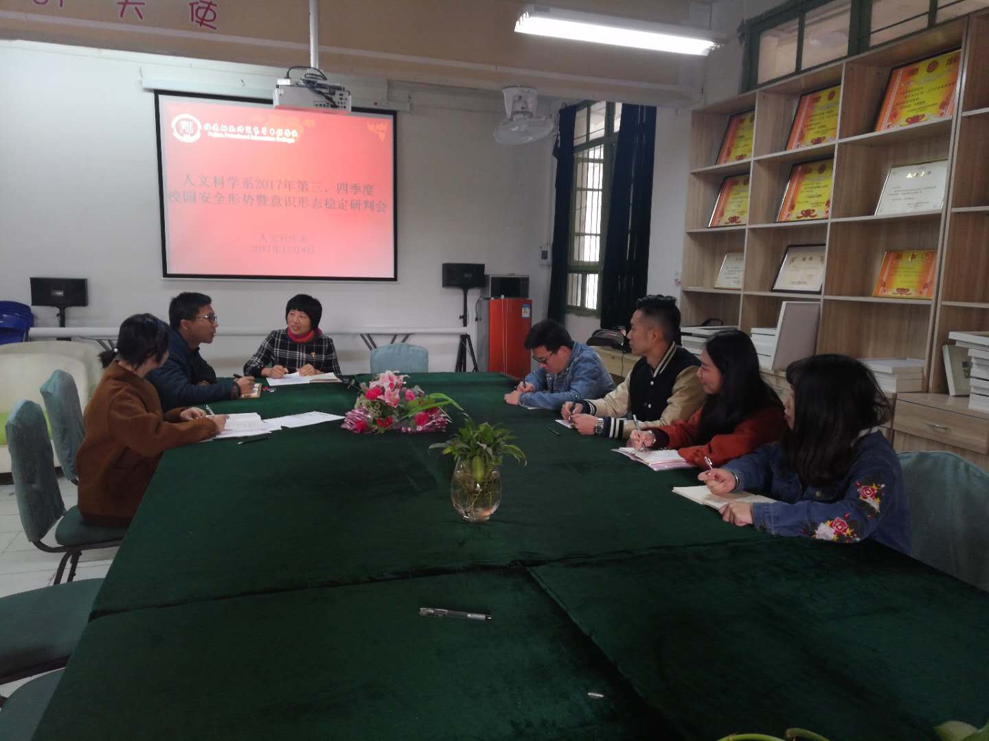 为落实我校校园安全稳定形势分析研判会议制度并加强意识形态稳定工作,2017年12月8日上午,我系召开校园安全形势稳定暨意识形态稳定研判专题会议,系党总支书记林琳、系党总支副书记周海林及各年级辅导员参会。会议由林琳书记主持。