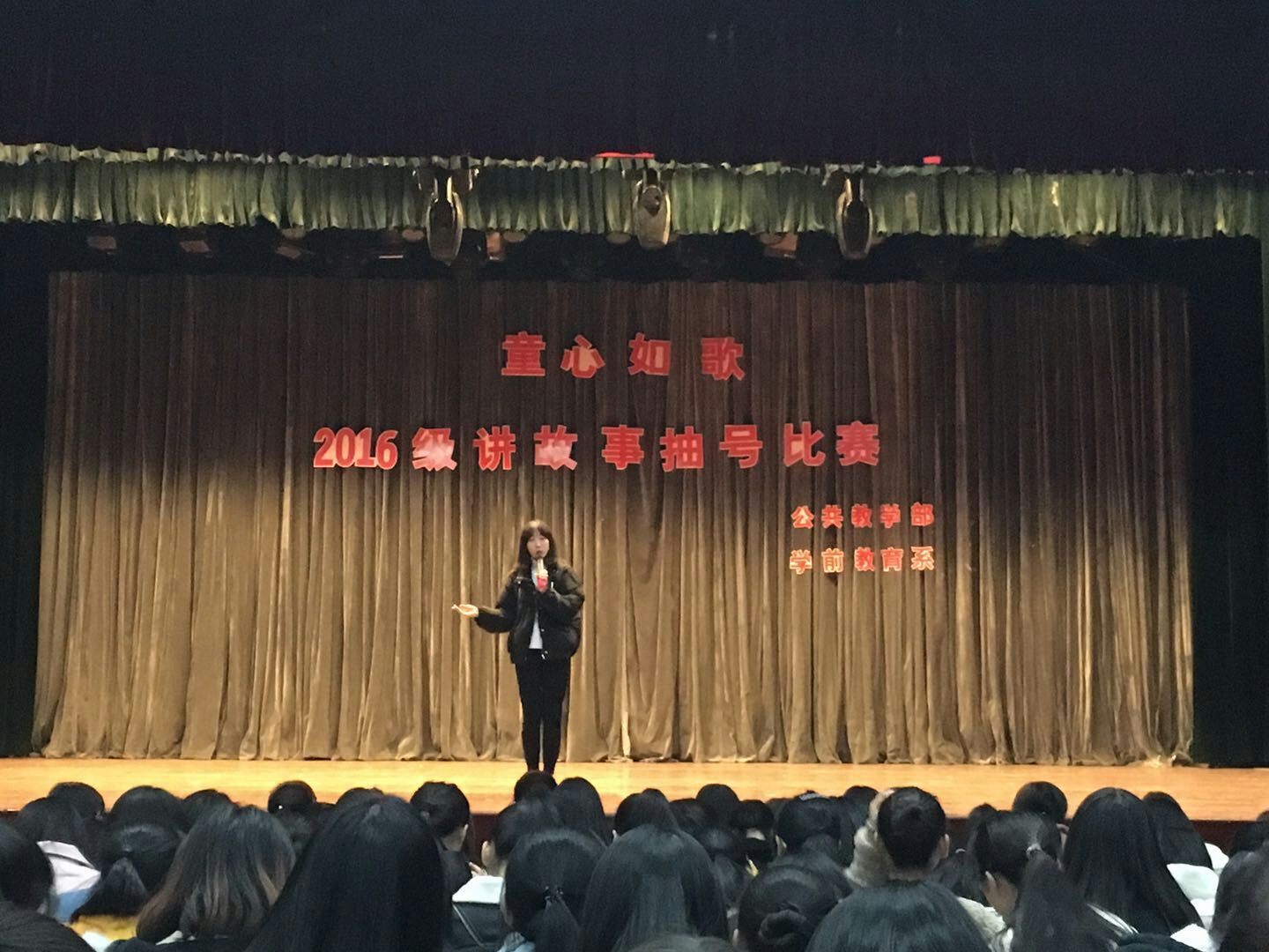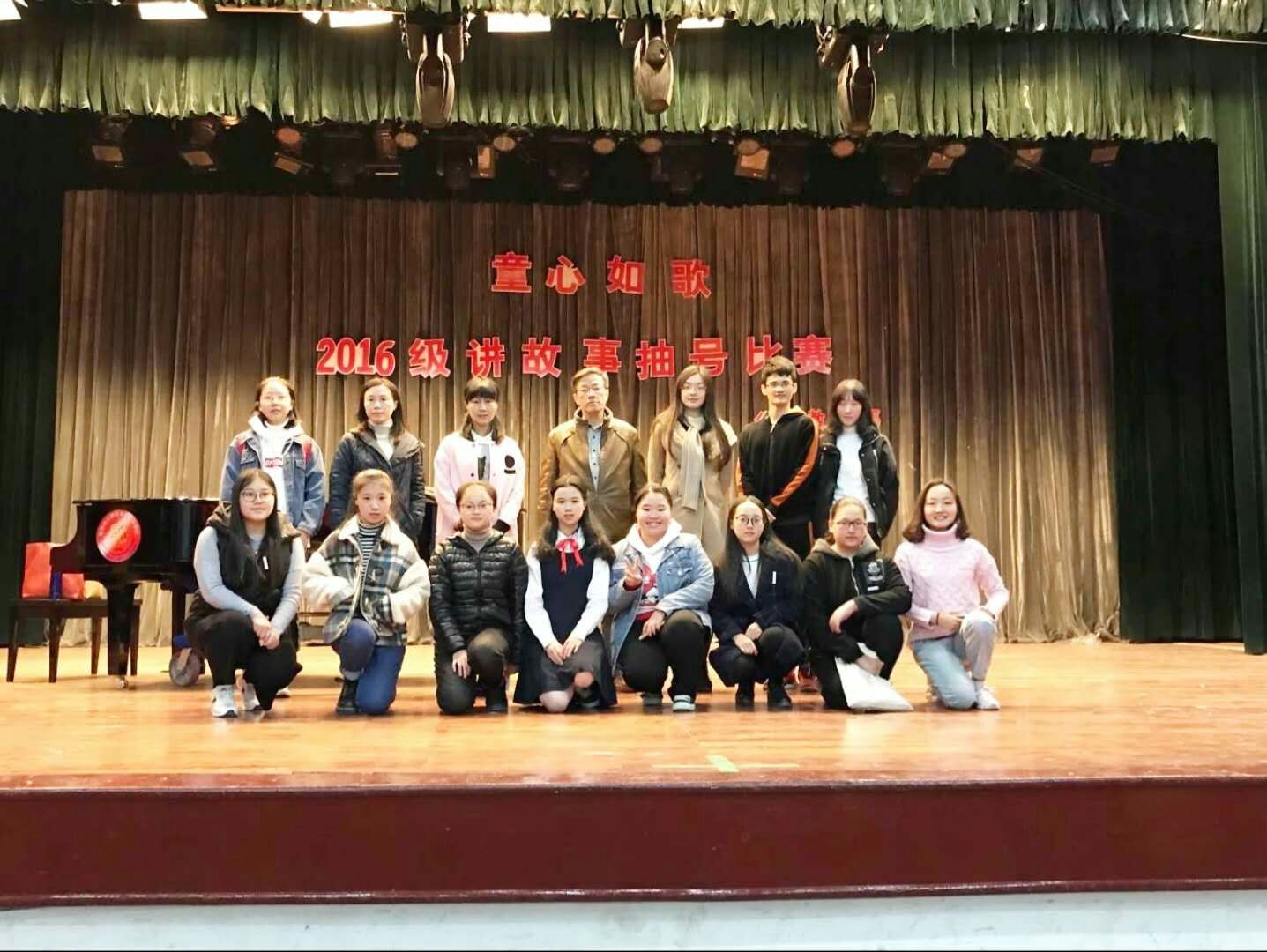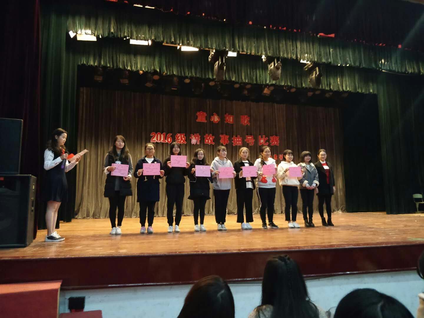 2017年12月11日晚上,为展示《教师口语》校级教改的阶段性成果以及学生的故事讲述技能,公共教学部口语教研组和学前教育系在校礼堂共同举办了"童心如歌"学前教育系2016级讲故事抽号比赛。抽号比赛是我校口语教学的一项传统赛事,其目的是在全校范围内大力推广师生普通话说、读、诵的水平,此项赛事近年来不断完善,目前成为《教师口语》校级教改项目的一项重要活动。