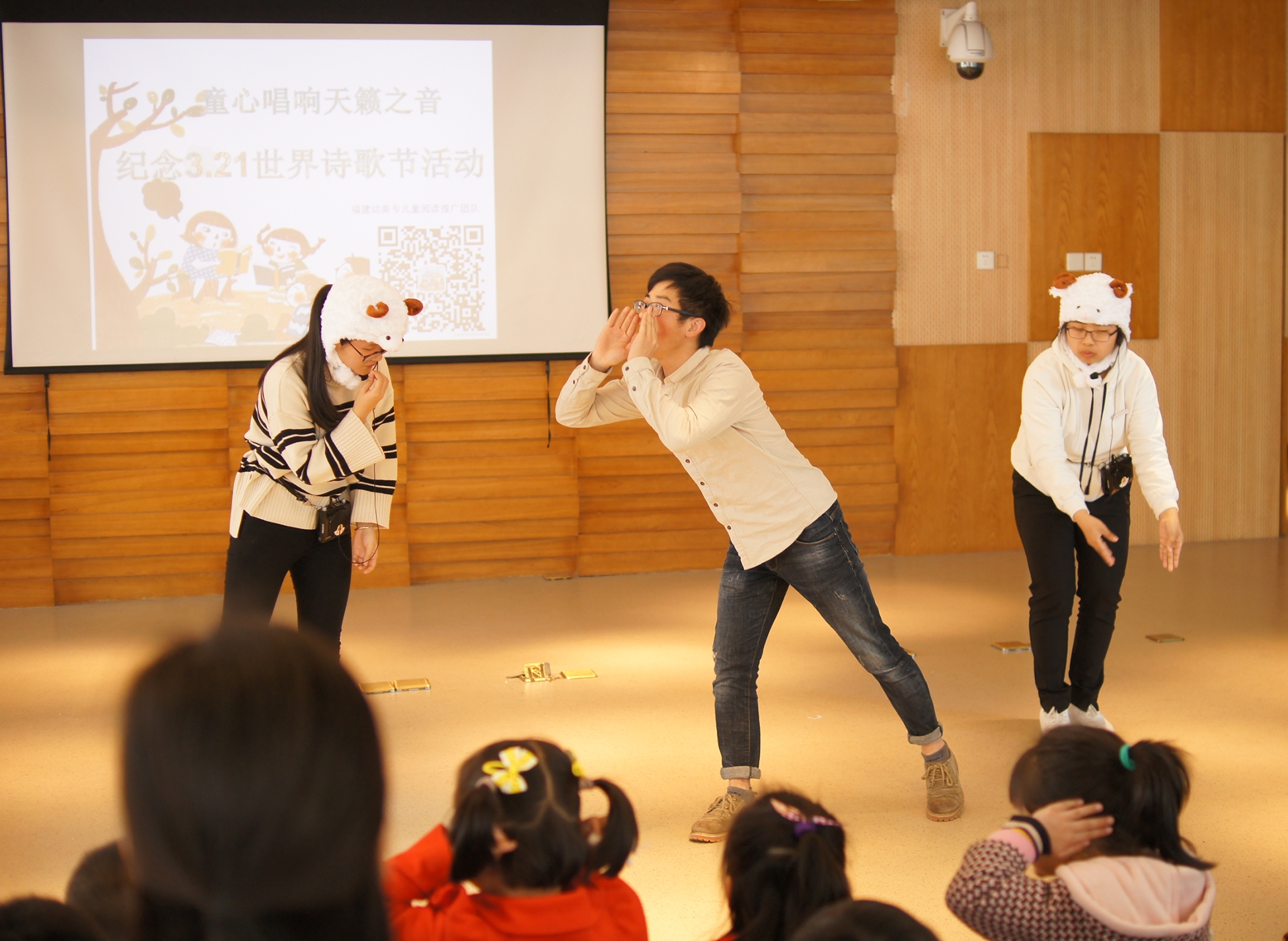 3月24日,我校儿童阅读推广团队在省少儿图书馆举办纪念"3.21世界诗歌节"活动,本次活动主题为"童声唱响天籁之音"。同学们为现场的小读者和家长表演了富有童谣元素的童话剧,并与孩子们一起玩起了童谣游戏。童话剧《狼来了》《小兔子乖乖》《老虎拜师》、童谣绘本故事《一园青菜成了精》,以及手指操、开火车等童谣游戏,给孩子们带来了欢声笑语。本次活动由我校与省少图书馆共同主办。