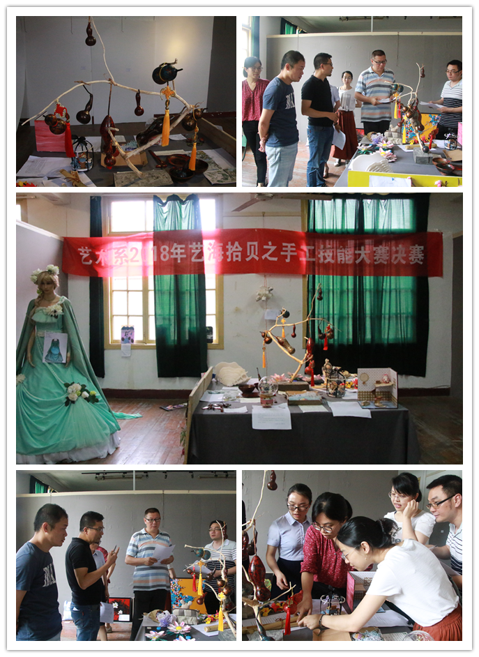 5月23日16时我系于美术楼举办了"2018年艺海拾贝之手工技能大赛决赛"。本场比赛由艺术系副主任陈青副教授、艺术系副主任林俊卿副教授、艺术系国画基础教研室主任瞿大明副教授、艺术系色彩教研室主任郭争光老师担任评委,艺术系党总支副书记刘舒敏老师及各级辅导员到场观看了本次比赛。