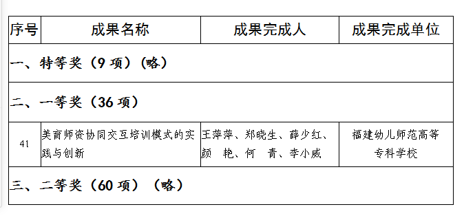 近日,省教育厅公布2018年省级教学成果奖获奖项目(闽教综〔2018〕12号),我系王萍萍教授领衔的《美育师资协同交互培训模式的实践与创新》获得一等奖,其成果完成人还有:郑晓生、薛少红、颜 艳、何 青、李小威等教师。