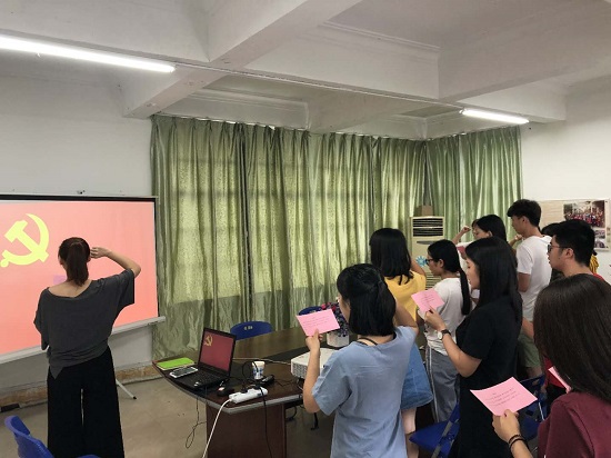 首先进行的是"筑梦起航,永葆党性初心"--毕业生党员重温入党誓词,宣誓仪式在庄严的国歌声中正式开始,在学生党员代表陈静同志的带领下,全体党员同志一同面朝党旗,高举右拳,大声宣出铮铮誓言。