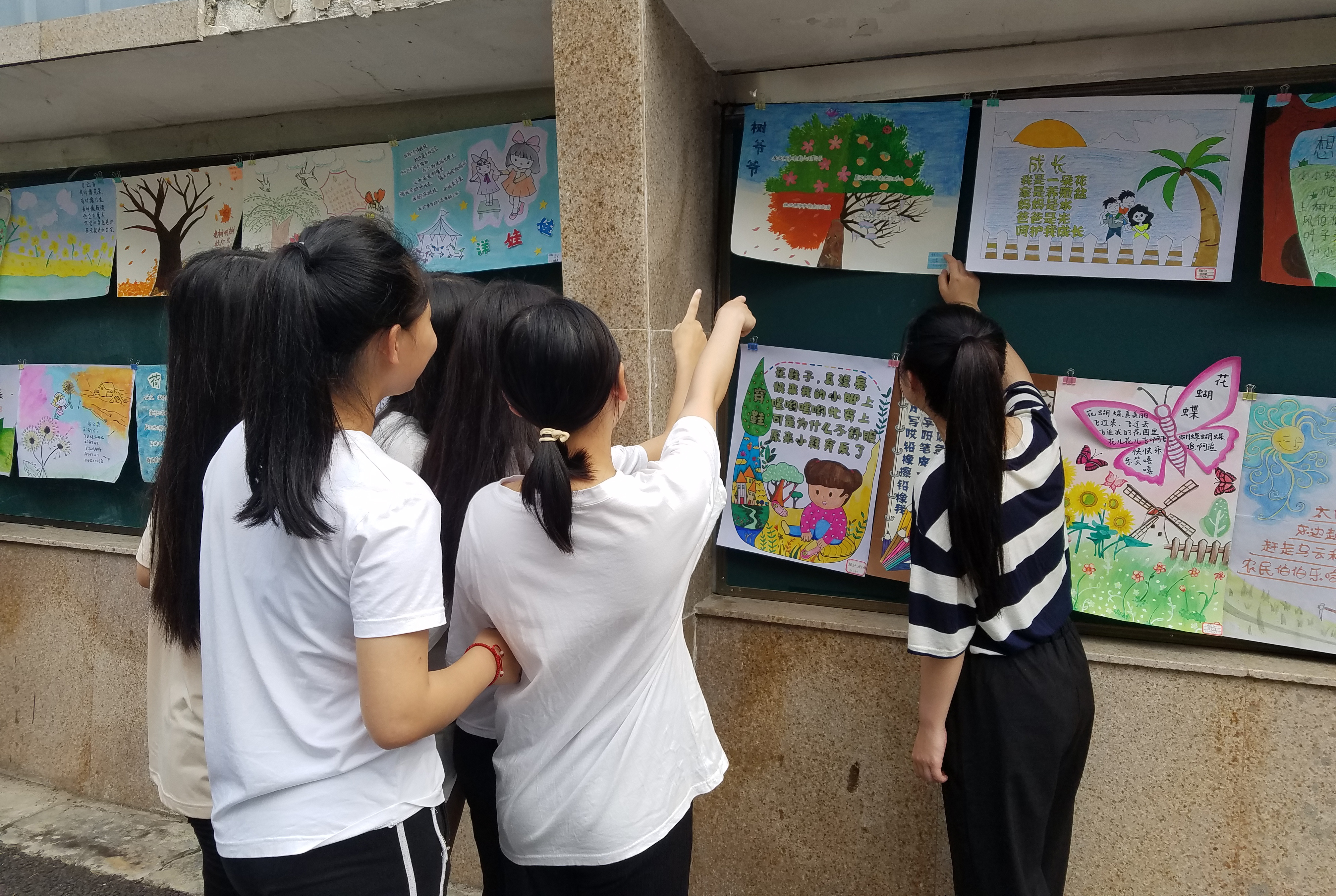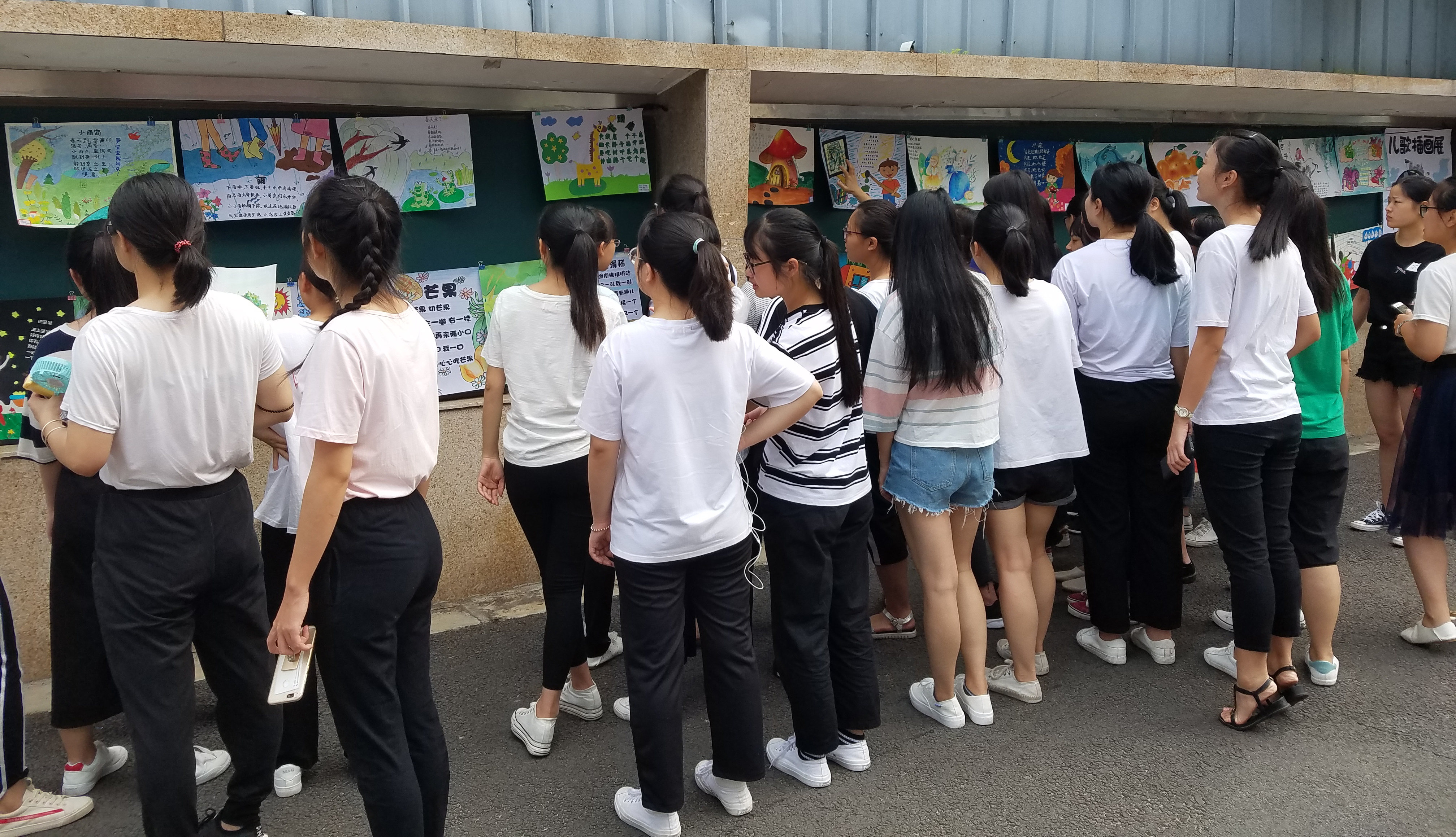 2018年6月12日"童趣 童韵——2018儿歌插画展"在白马校区举办。此次活动展出白马校区2017级学前、早教及2016级中新班学生的原创儿歌插画近百幅优秀作品,同学们在儿童文学老师指导下,以原创儿歌文本配上艺术插画展现童趣,张扬童心,彰显童韵,展示了她们儿童文学课程学习的成果。儿童文学课程教学坚持教师教育"实践取向"的理念,注重实际技能和多元化综合素质的培养,指导学生进行跨领域综合实践,实现了美术创作能力的迁移,提升了学生们的专业能力,完善学生作为优秀幼师生的能力结构。