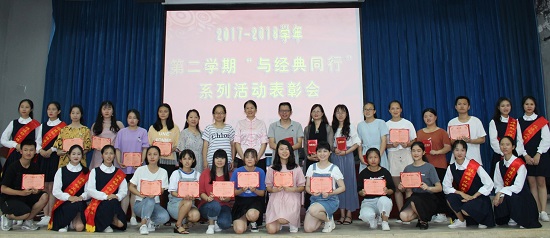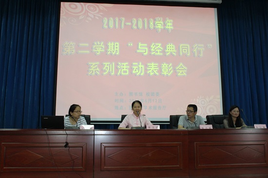 6月12日,2017-2018学年第二学期"与经典同行"系列活动表彰会在图书馆四楼报告厅举行。实训处陈忠辉处长、图书馆胥文玲馆长、校团委王蔷老师、学前教育系杨幼梅老师应邀出席表彰会,获奖人员及各系学生代表300余名到场参加。