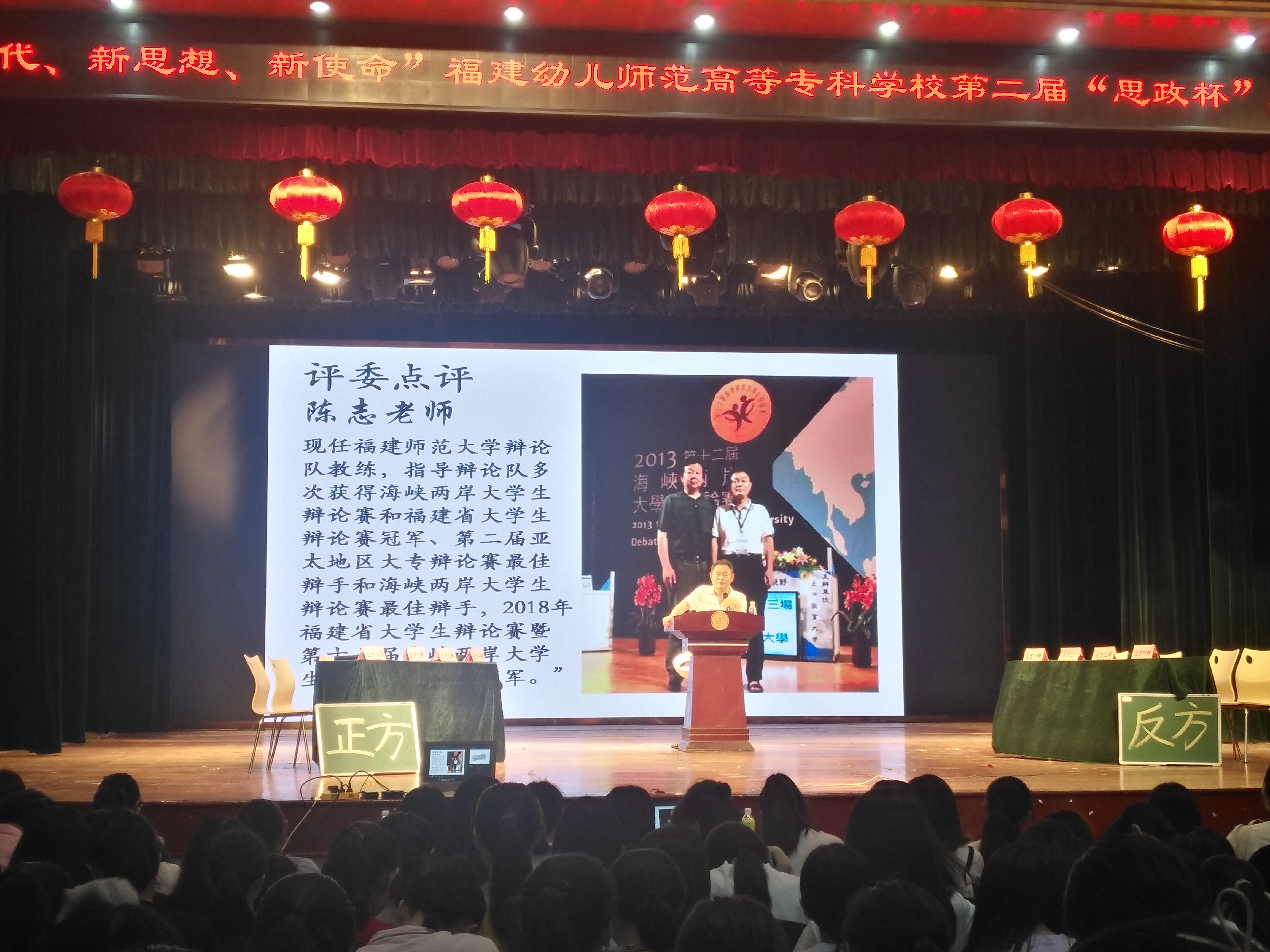 为了激发我校青年学生的爱国情操和责任担当,在思维碰撞中实现思想的交流,加深对新时代新思想新使命的深刻了解,我校于2018年6月15日下午两点,在礼堂隆重举行第二届"思政杯"大学生辩论赛。本次比赛由福建幼儿师范高等专科学校主办,马克思主义学院,校团委,学工部承办。郑晓生副校长出席了本次比赛,福建师范大学校辩论队陈志副教授,马克思主义学院伊文婷院长,校团委唐川书记,学工部姜琪副部长,教务处陈香珠副处长、公共教学部党支部张航书记、马克思主义学院高雯婷老师莅临指导并担任评委。