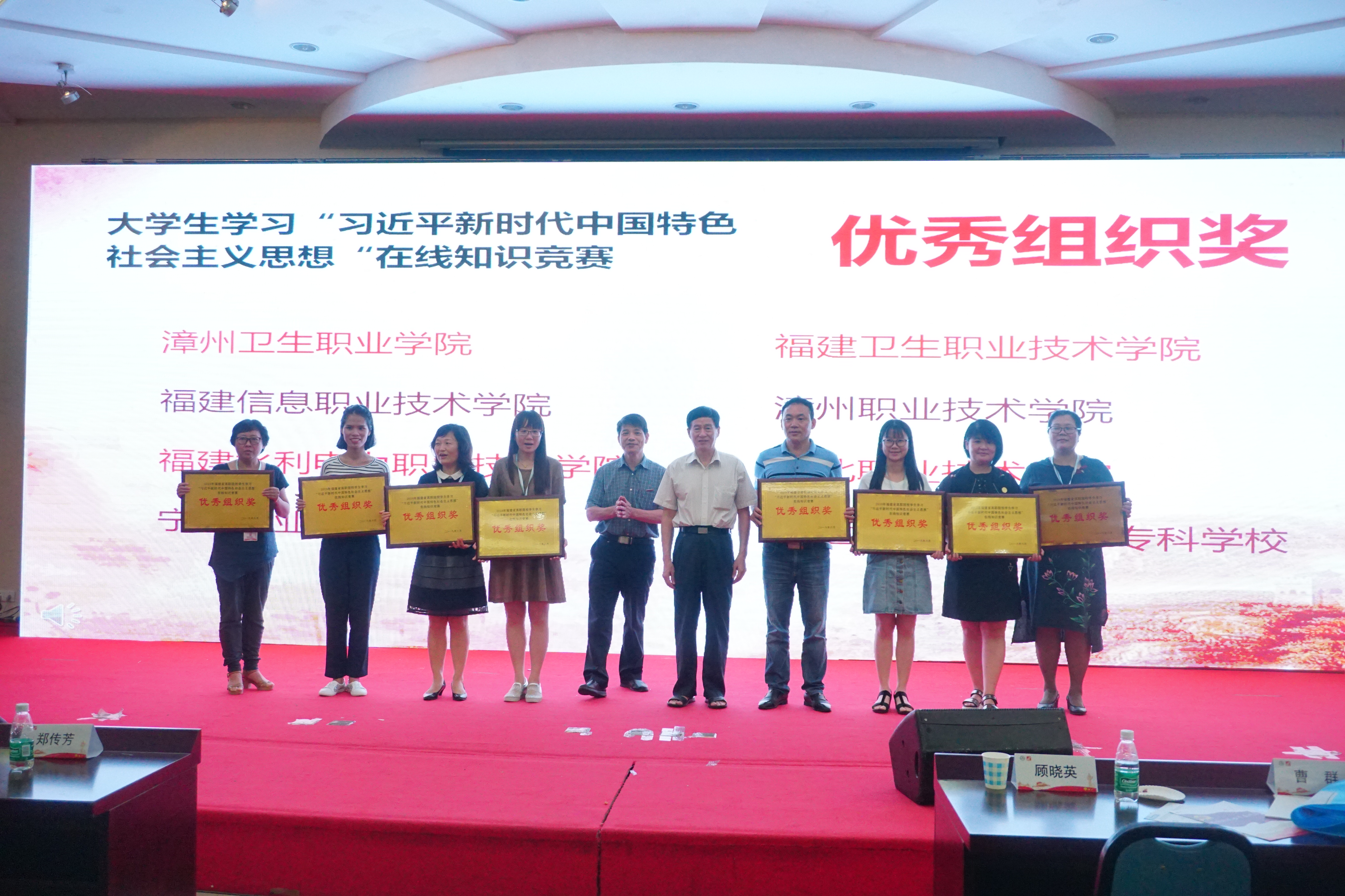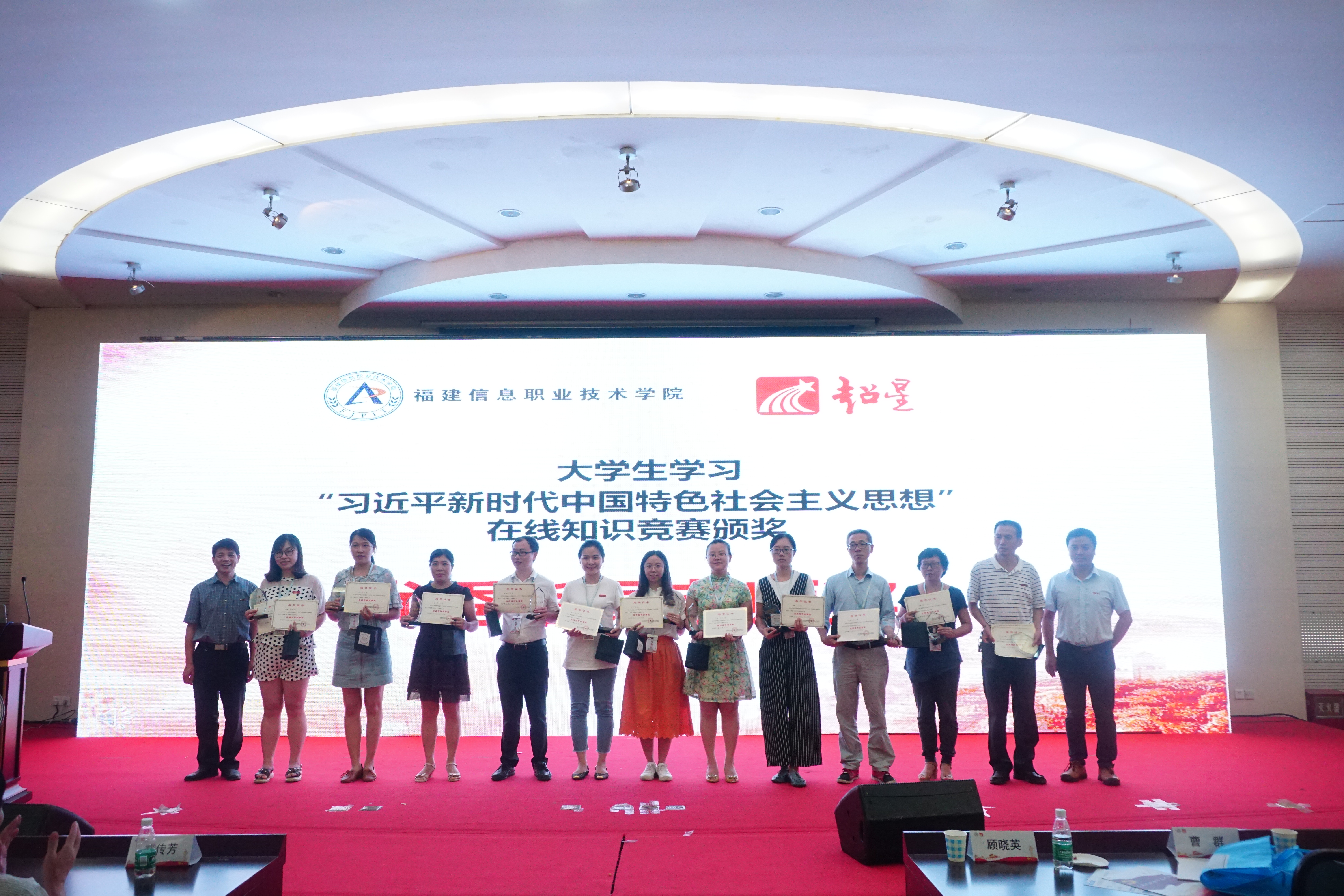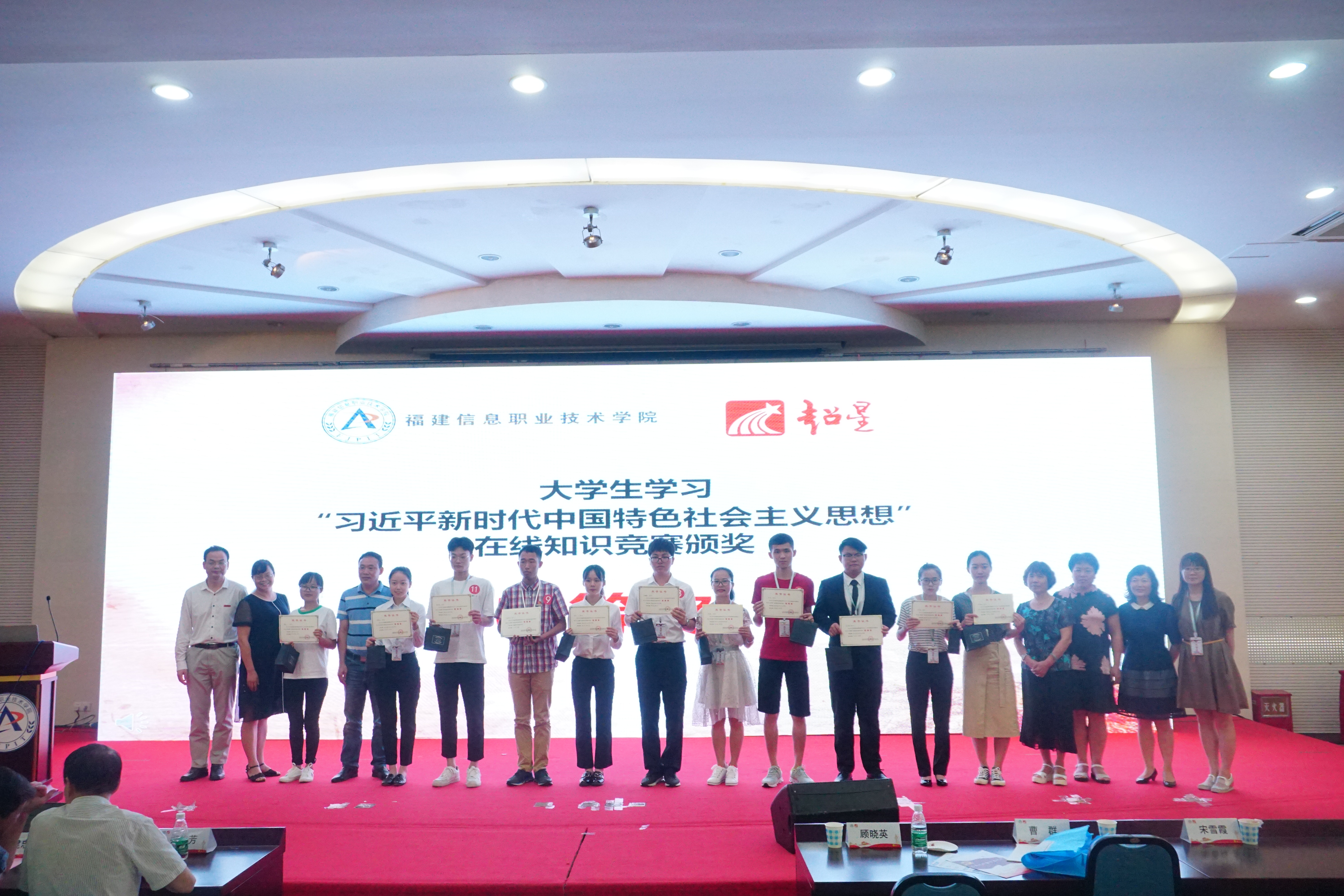 2018年6月22日,由福建省高校思想政治理论课教学指导委员会高职分委会、福建省高职高专院校思想政治理论课建设联盟主办,福建信息职业技术学院马克思主义学院、北京超星尔雅教育科技有限公司、福建高职院校思想政治理论课在线研究中心和福建省高校思想政治理论课名师工作室——黄冬福名师工作室承办的"2018版教材背景下思政课建设研讨会暨高职院校马克思主义学院院长论坛"在福建信息职业技术学院行政楼六楼多功能厅隆重召开,并举行大学生学习"习近平新时代中国特色社会主义思想"在线知识竞赛现场赛和颁奖典礼。我校马克思主义学院院长伊文婷教授和郑丽萍、郑舒丹、高雯婷老师参加会议,我校外语系方淑钰同学荣获大学生学习"习近平新时代中国特色社会主义思想"在线知识竞赛特等奖,郑丽萍、郑舒丹老师荣获优秀指导老师奖,我校荣获优秀组织奖。
