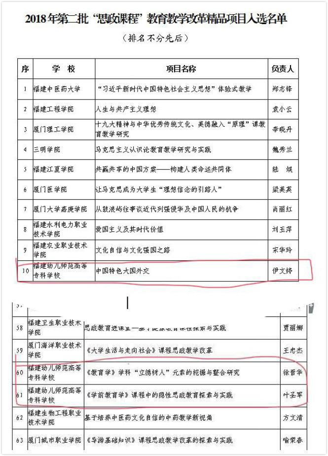 近日,省教育厅公示第二批"思政课程""课程思政"教育教学改革精品项目入选名单,由人文科学系徐晋华副教授带领项目组成员(副校长郑晓生教授、思政课教师张丹凤、人文科学系党总支林琳书记)申报的《<教育学>学科"立德树人"元素的挖掘与整合研究》项目入选省教育厅第二批"课程思政"教育教学改革精品项目。